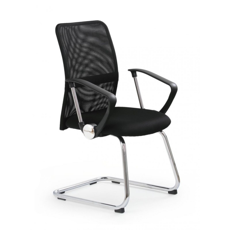 Elegáns, szánkótalpas tárgyalószék fekete színben. A modern megjelenésű szék középmagas, vékony, rugalmas és légáteresztő membrán szövettel bevont háttámlával, krómacél vázzal, karfákkal rendelkezik. Kiváló választás lehet tárgyaló- és várótermekbe, ügyfelek fogadására.