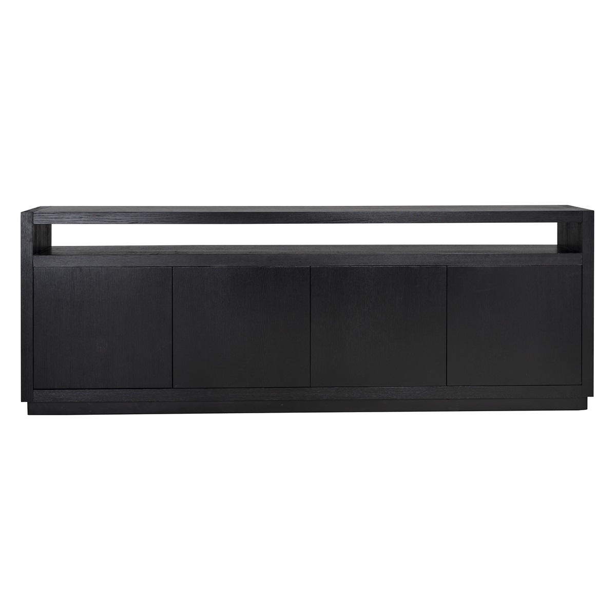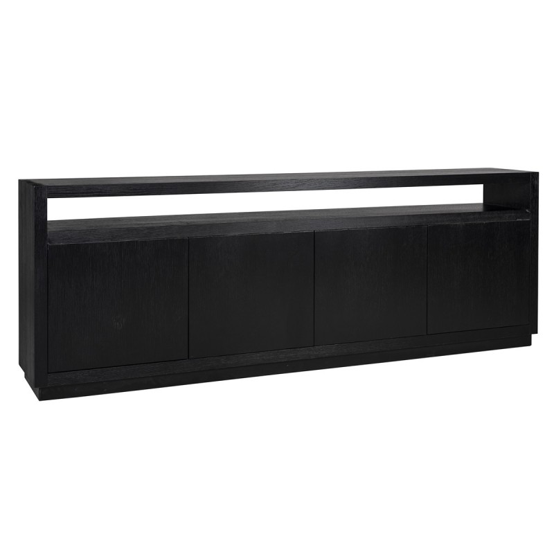 Elegáns megjelenésű, minimál stílusú, 4-ajtós fafurnéros komód, belső polcokkal, fekete színben.