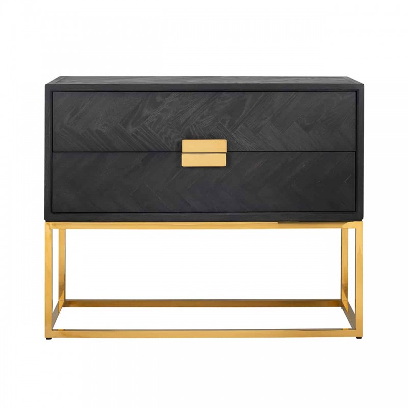 Elegáns komód arany színű krómacél lábazattal és fogantyúkkal, fekete színűre pácolt, halszálka mintázatú tölgyfa korpusszal.