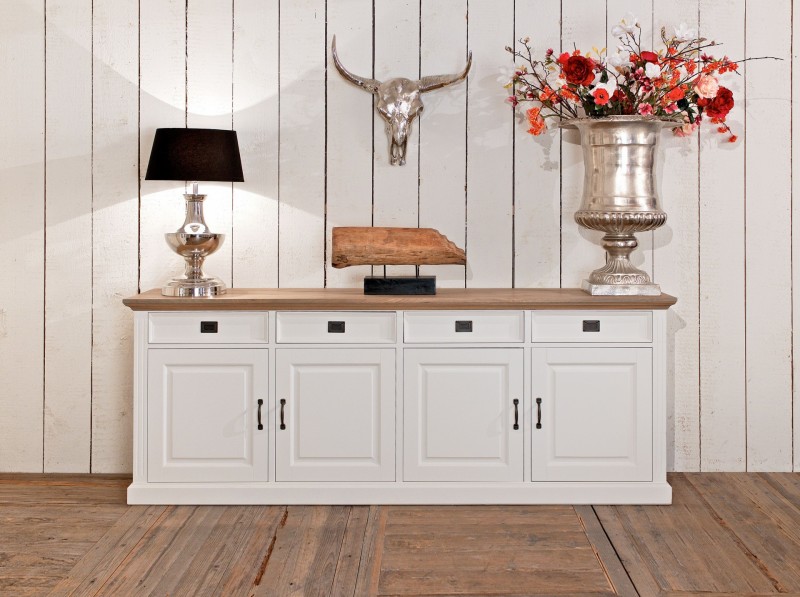 Stílusos, kontrasztos színekben pompázó 4-ajtós, 4 fiókos, fenyőfából és tölgyfából készült, vintage stílusú komód. A komód az Oakday kollekció egyik eleme, így egyéb nappali- és étkező bútorok rendelésére is van lehetőség. További információért kérjük érdeklődjön kollégáinknál.