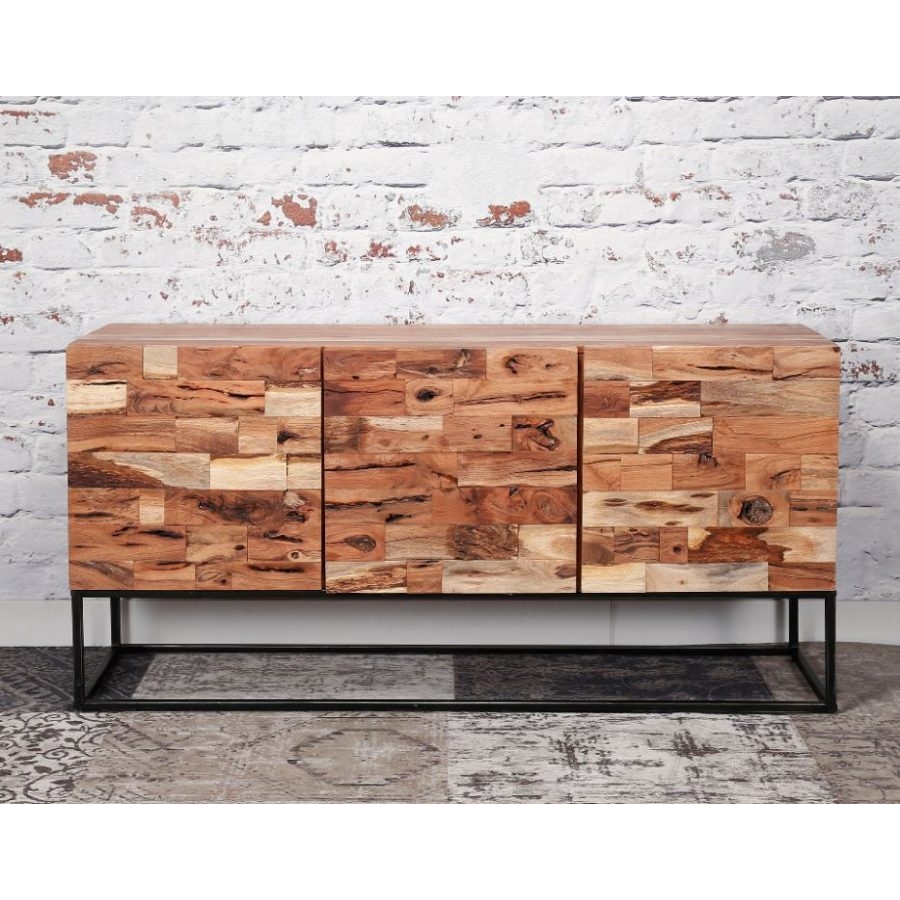 Modern, akácia fából készült komód három fiókkal, rozsdamentes acél lábakkal.