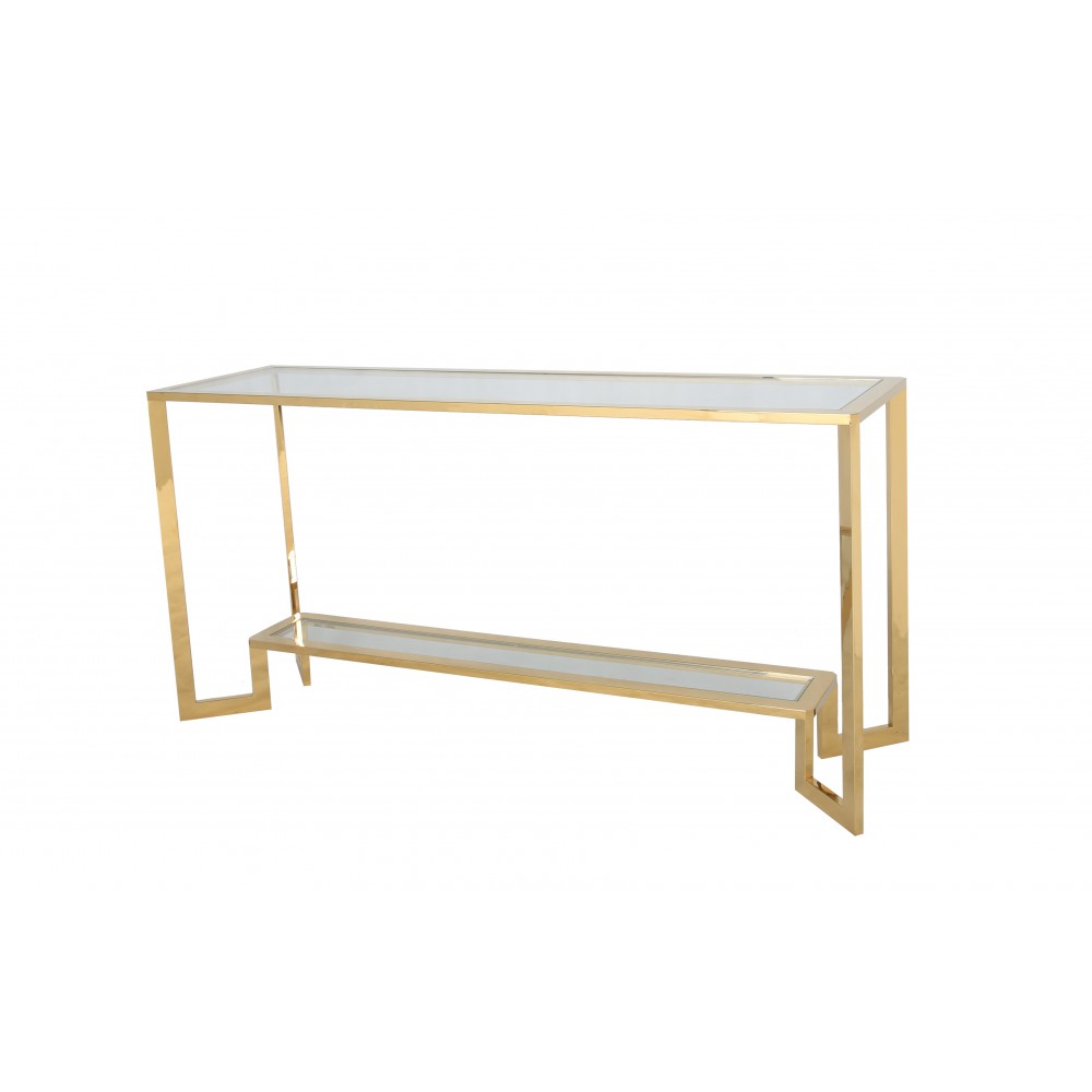 Elegáns, design konzolasztal arany színű vázzal, átlátszó üveglapokkal
