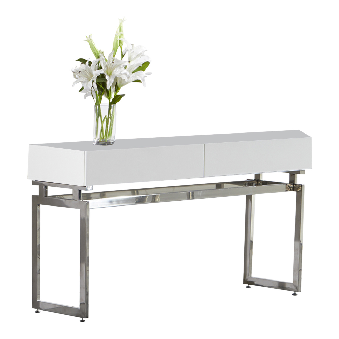 Stílusos konzolasztal 2 db fiókkal, magasfényű fehér lappal, krómacél vázzal.