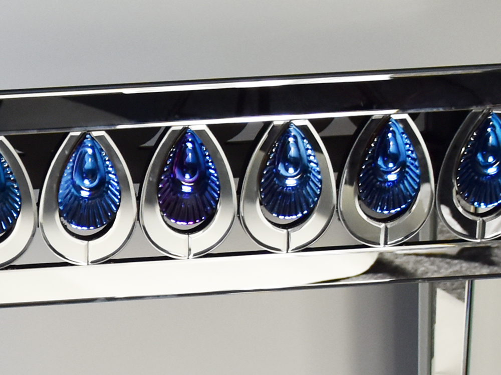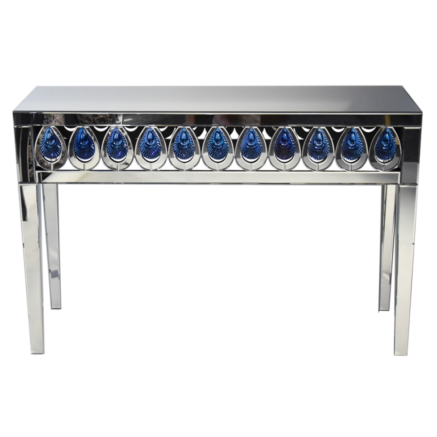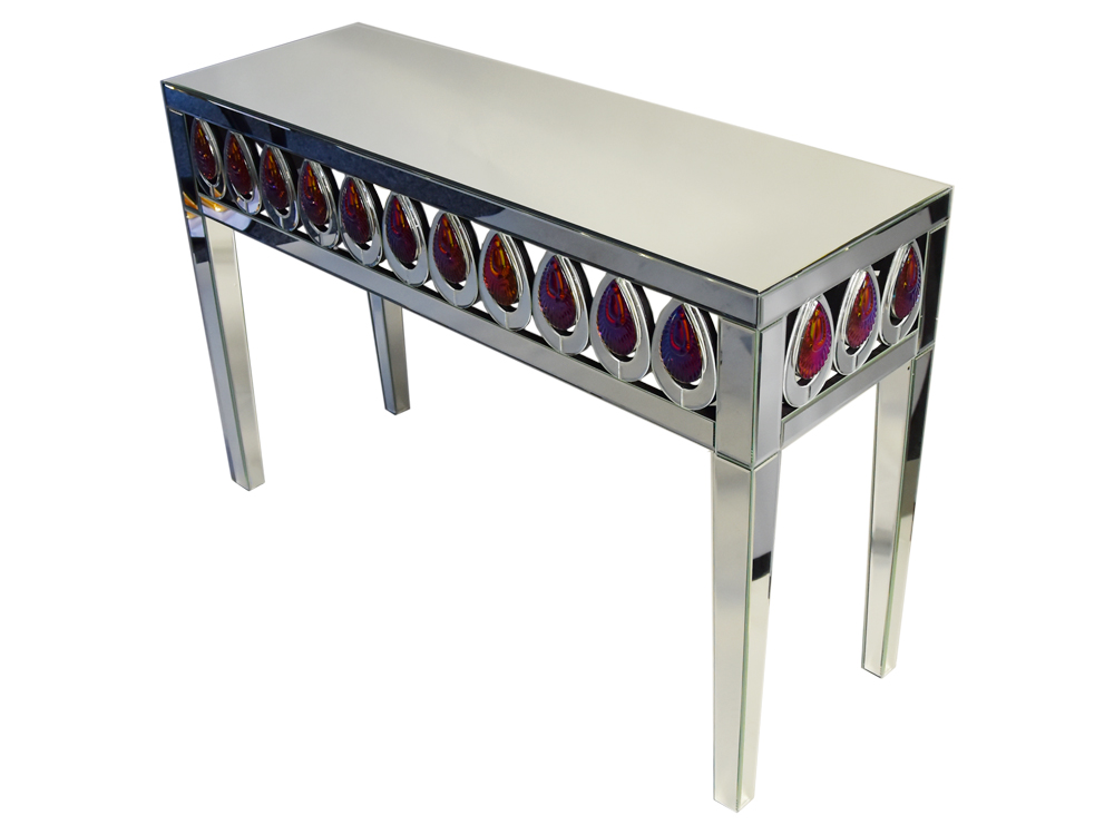 Elegáns, pávatoll mintázatú konolasztal krómacél vázzal, üveglappal.