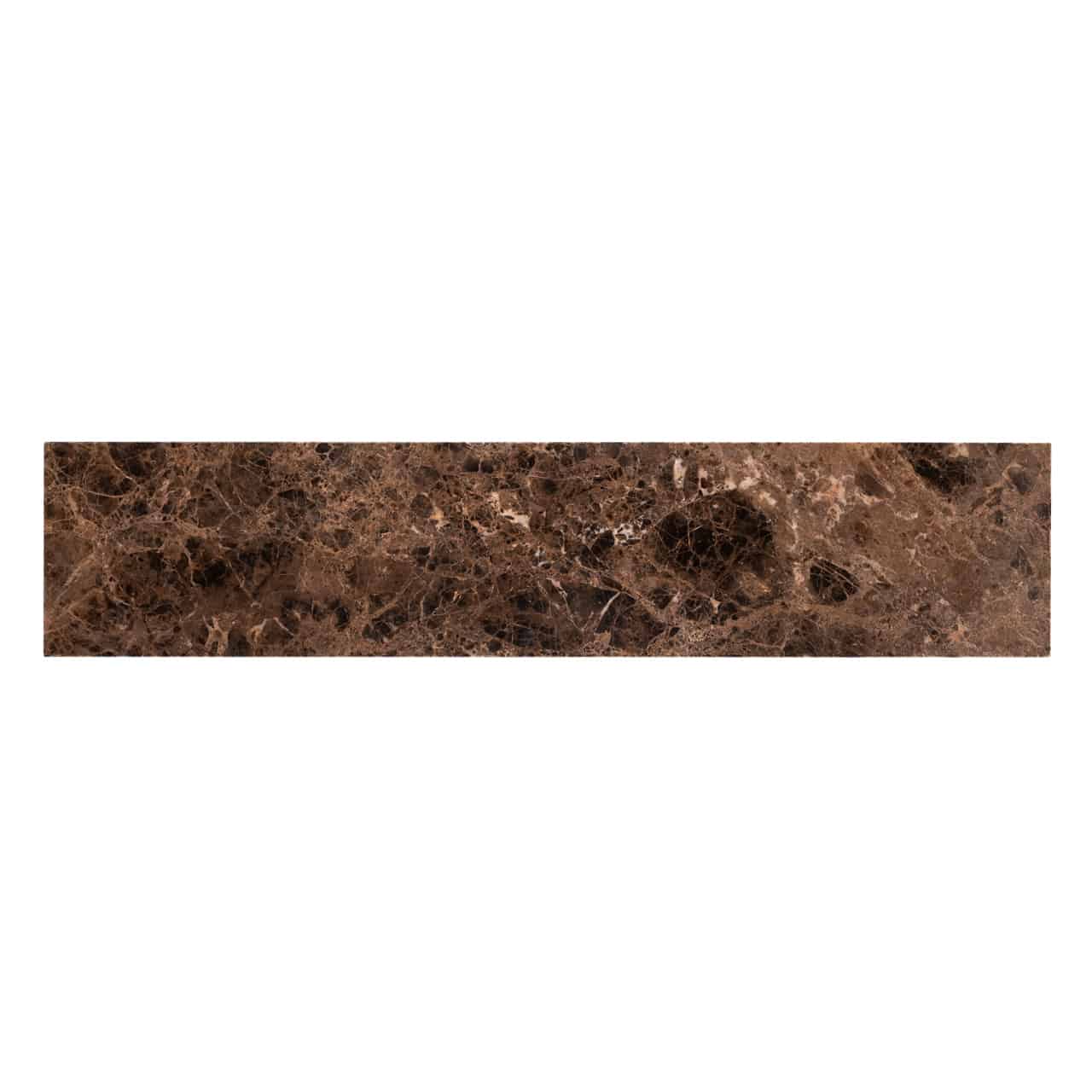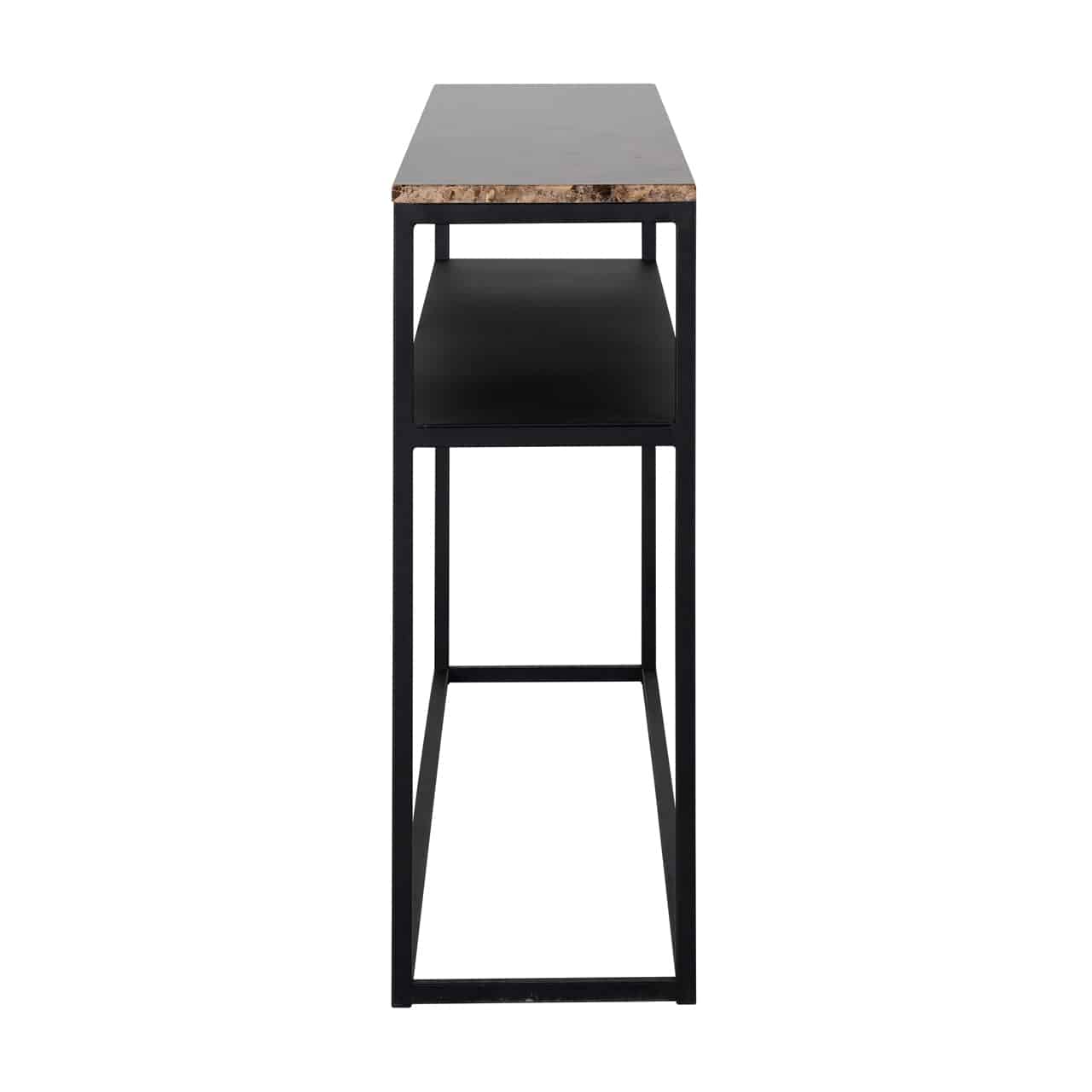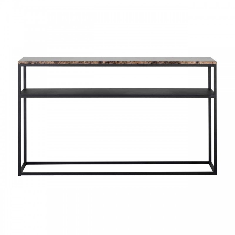 Elegáns konzolasztal barna színű márványlappal, feketére festett fém vázzal.