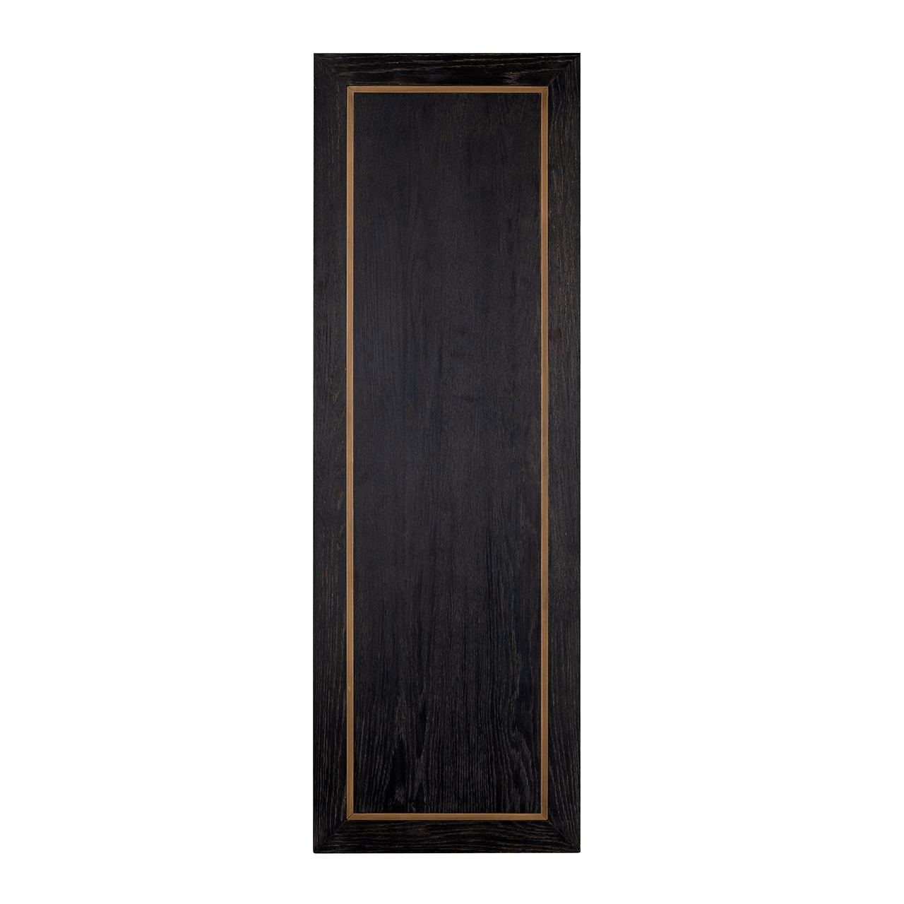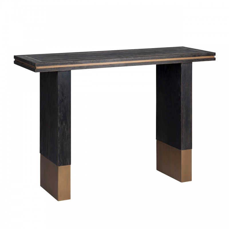 Elegáns megjelenésű, fafurnéros, arany színű krómacéllal kombinált konzolasztal.