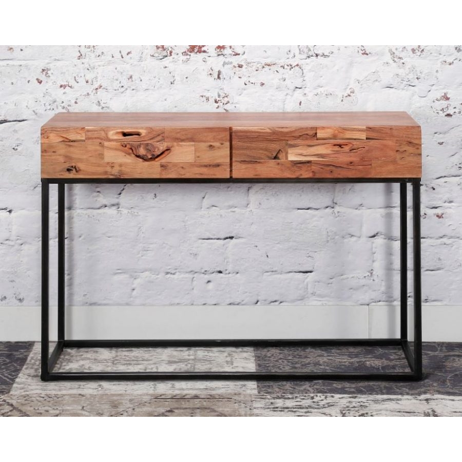 Modern, akácia fából készült konzolasztal két fiókkal, rozsdamentes acél lábakkal.