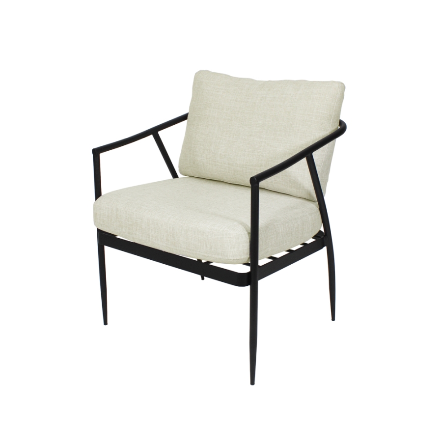 Elegáns kerti fotel fekete festett acél vázzal, 2 db világos színű párnával. Belső és külső térben egyaránt használható. A párnák a vázhoz tépőzárral rögzíthetőek, huzatuk levehető, mosható. A fotel egy kollekció része, stílusban hozzáillő tükrök, konzolasztalok, egyéb termékek is elérhetőek.
