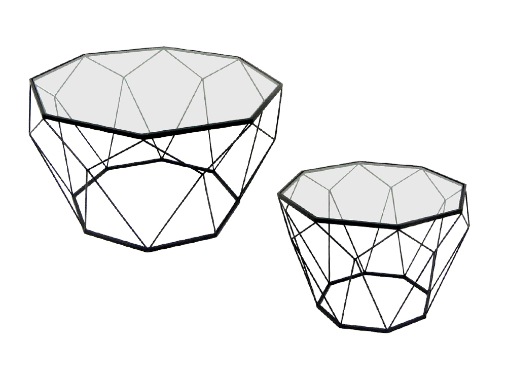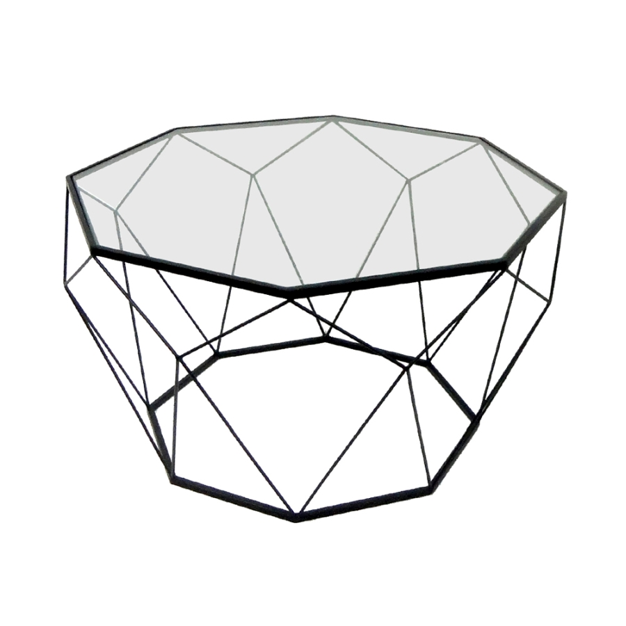Indusztriális stílusú dohányzóasztal fekete festett acél vázzal, átlátszó üveglappal.