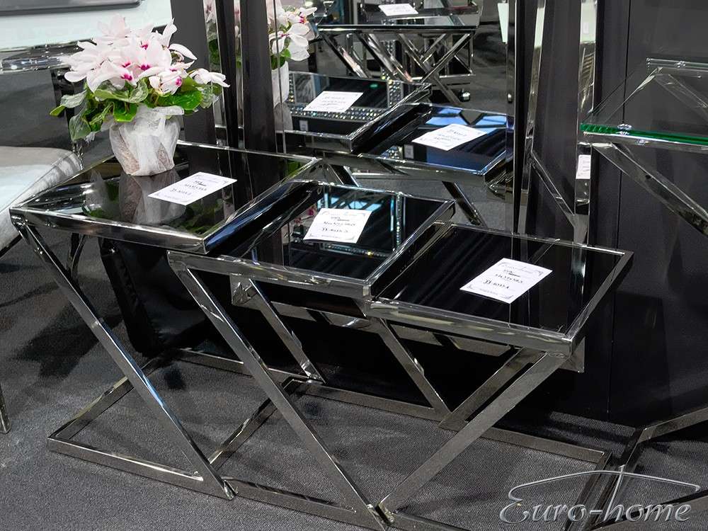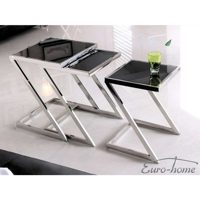 Modern, egymásba csúsztatható lerakóasztal fekete üveglappal, krómacél vázzal, háromféle méretben (külön-külön is rendelhető).