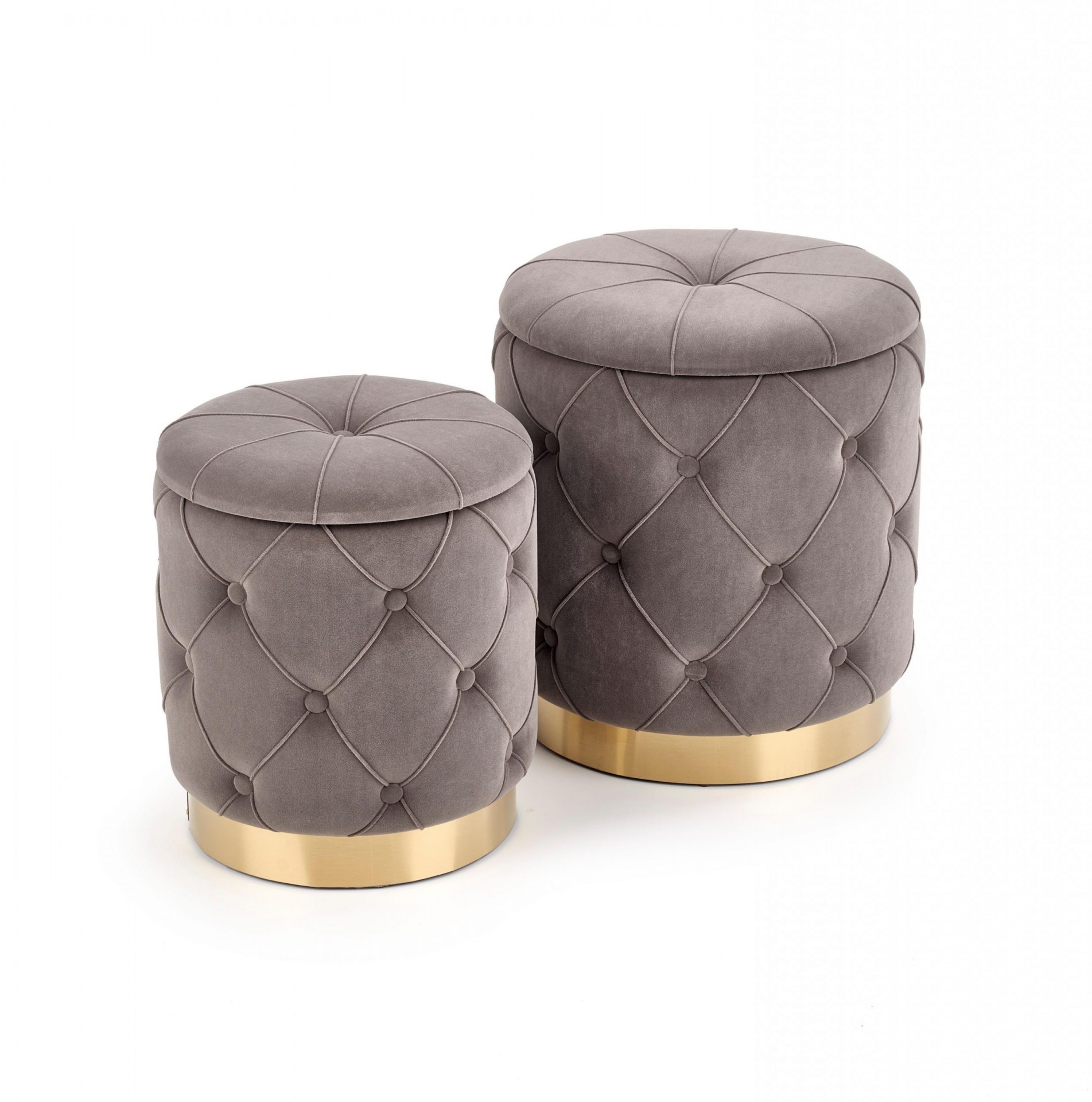 Elegáns tárolós puff-szett arany színű krómacél lábazattal, bársony szövet bevonattal.