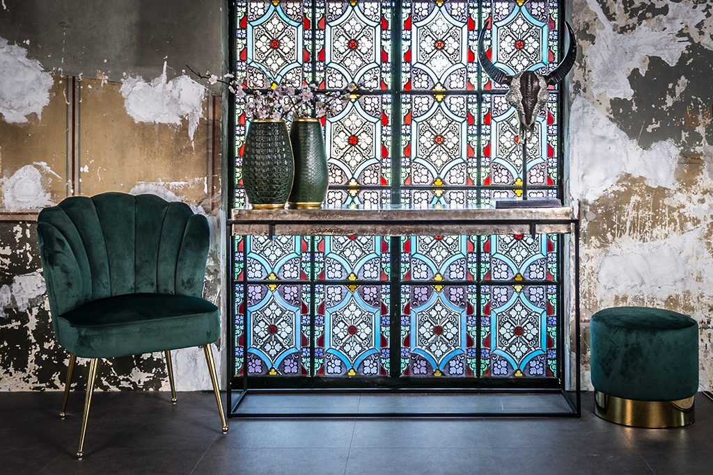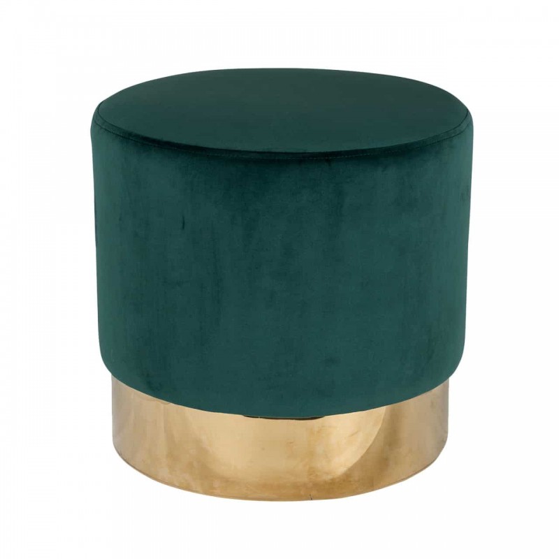 Elegáns puff trendi velvet-szövet bevonattal, arany színű krómacél lábazattal.