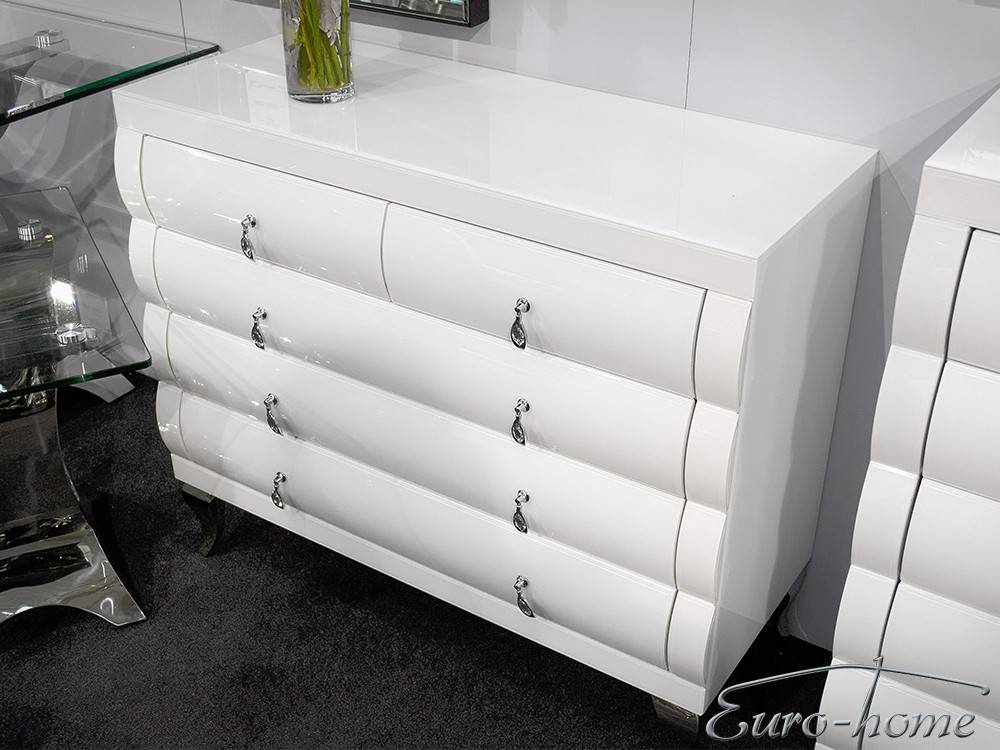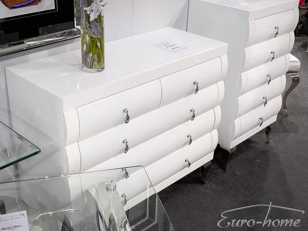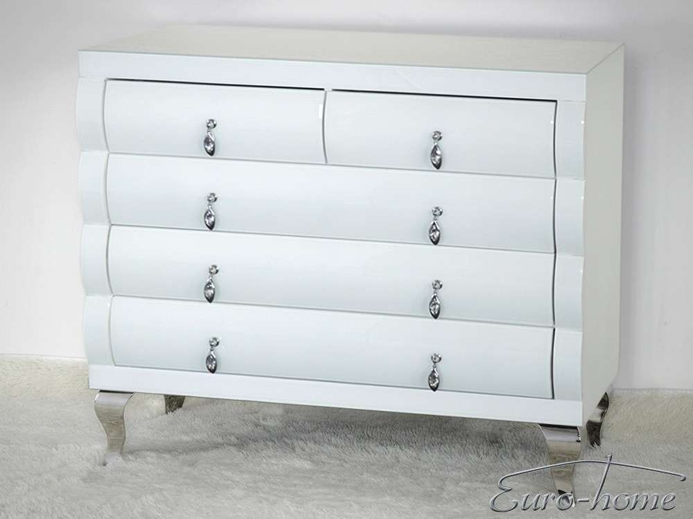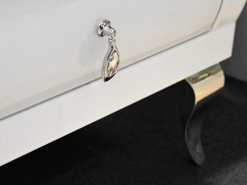 Elegáns, fehér színű tükrös komód kristály fogantyúkkal, íves lábakkal.