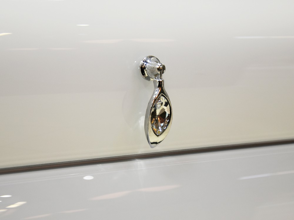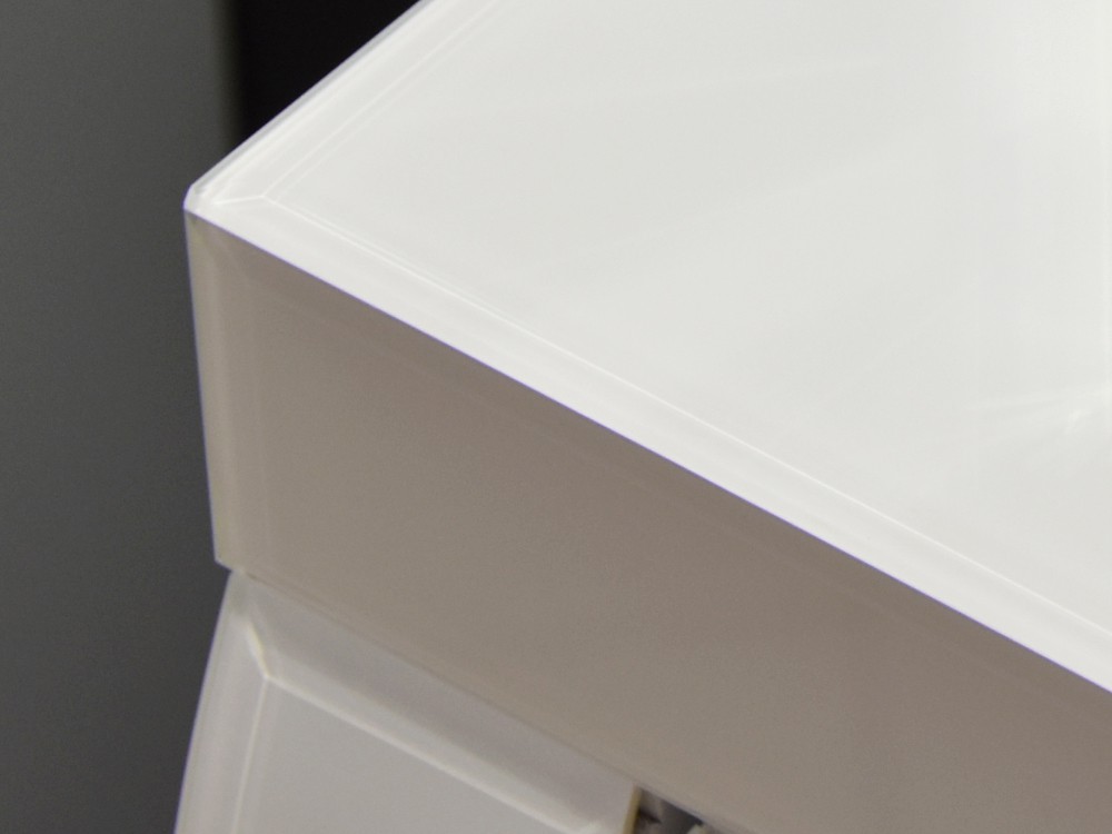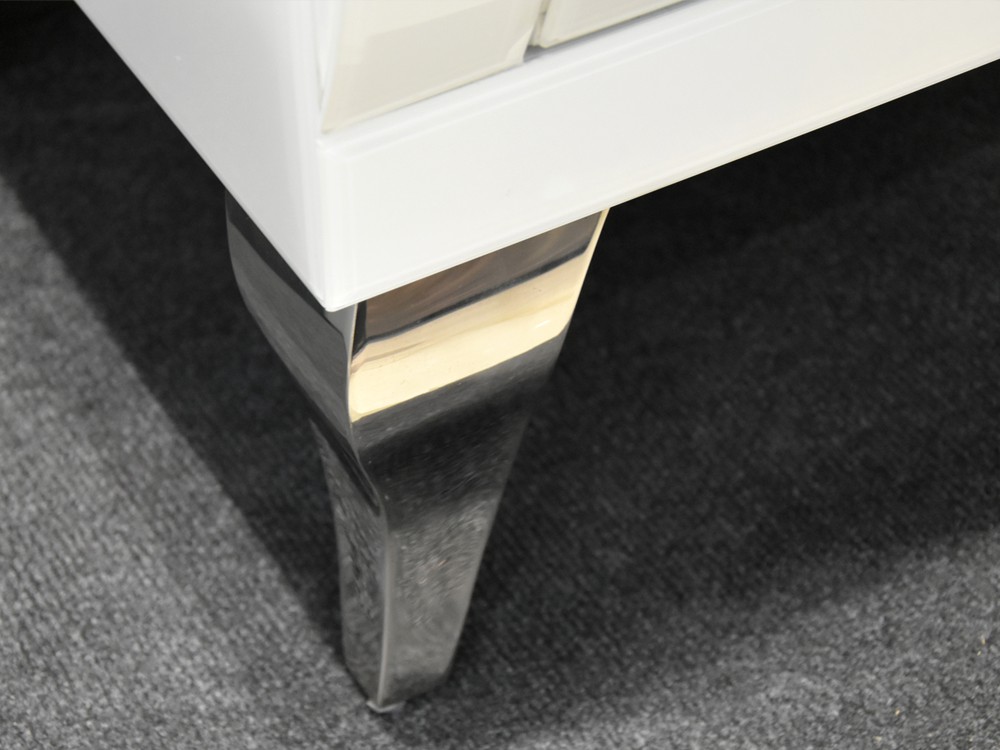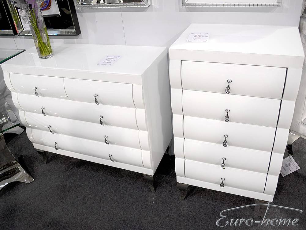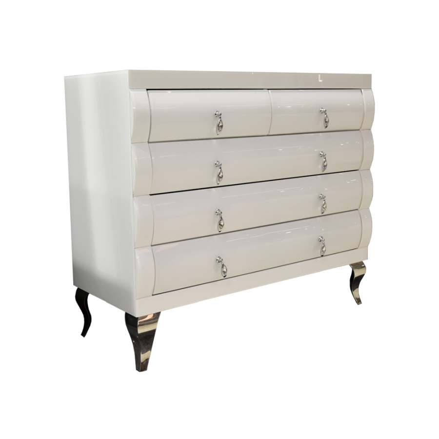 Elegáns, fehér színű tükrös komód kristály fogantyúkkal, íves lábakkal.