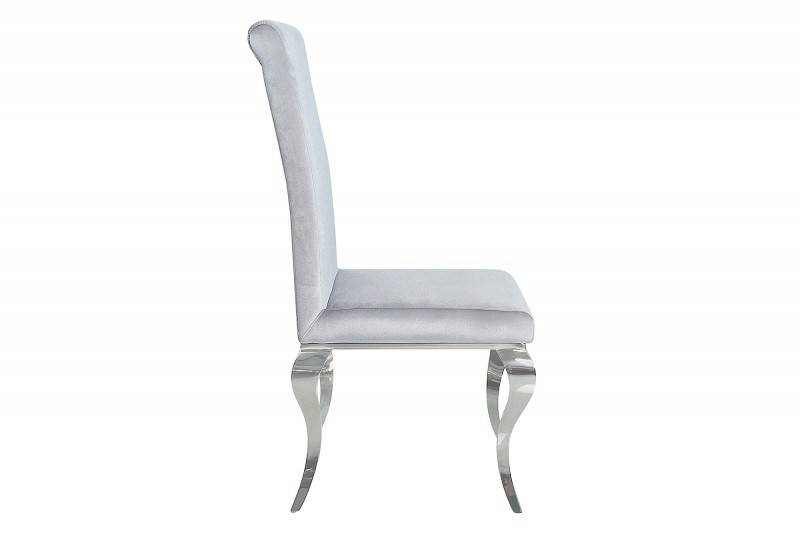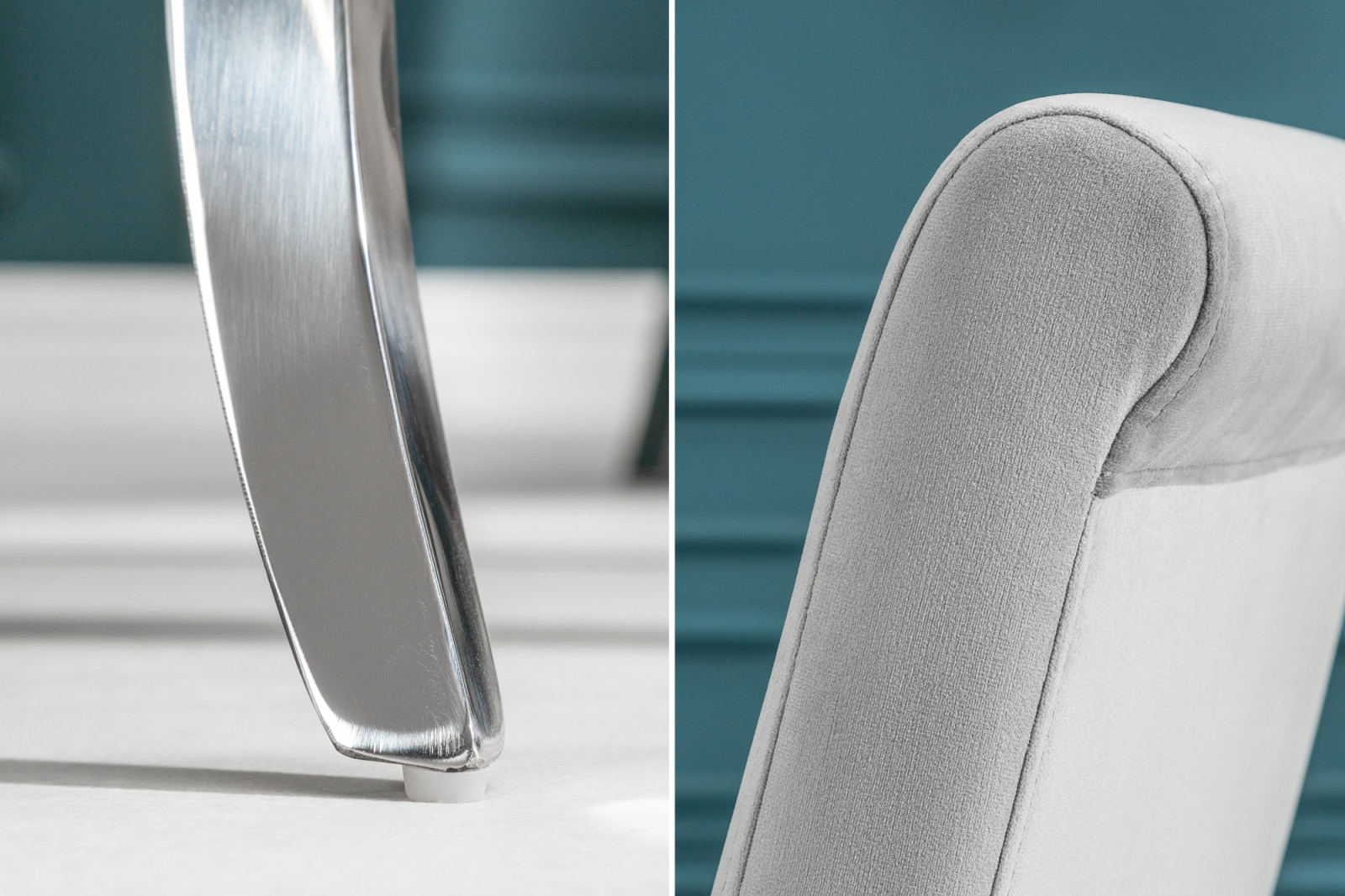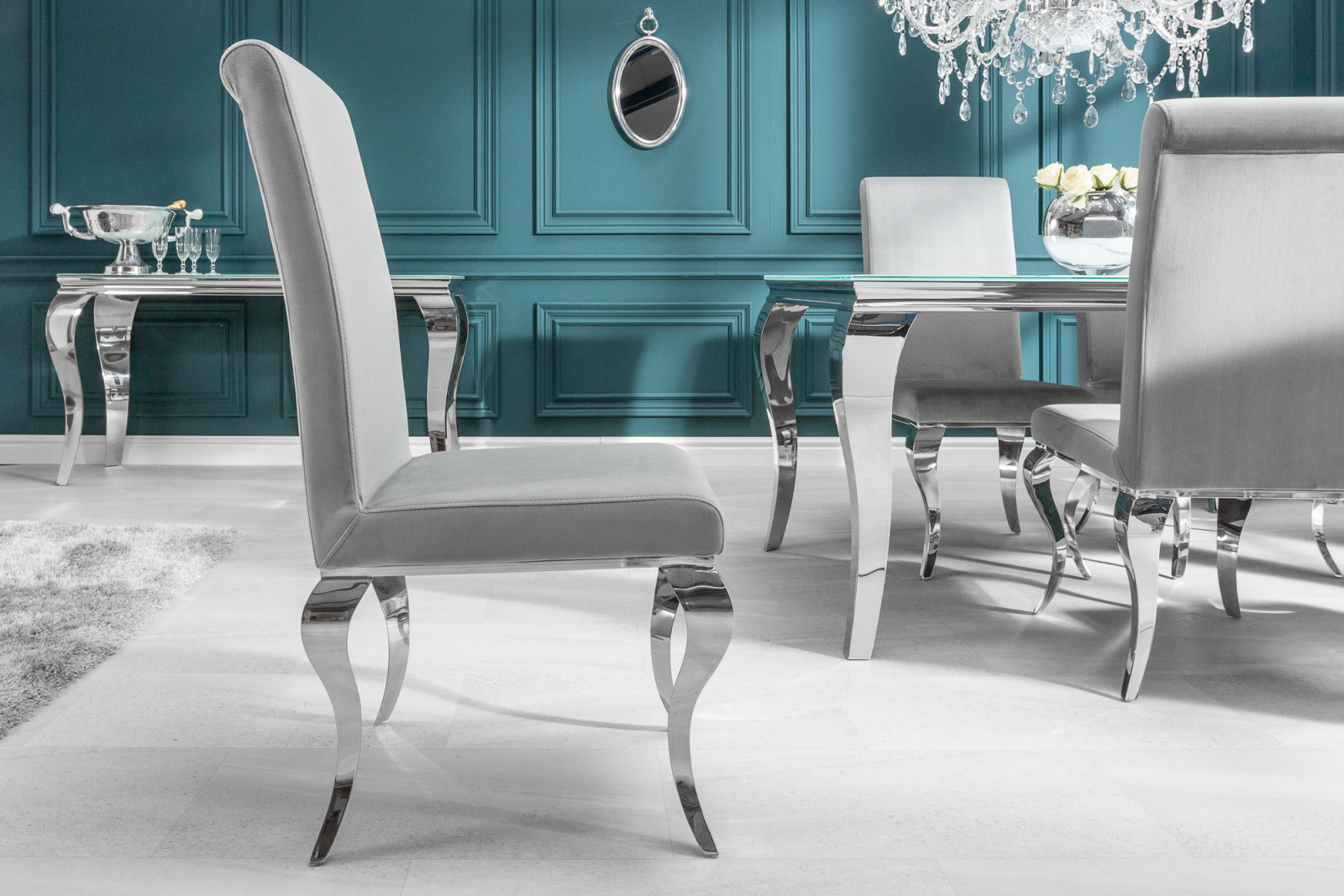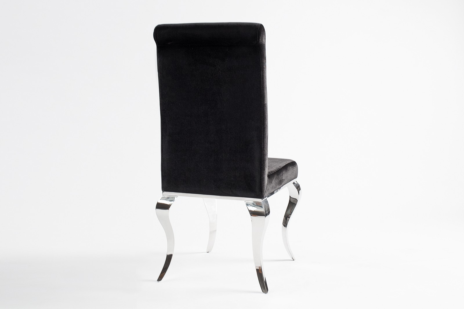 Elegáns étkezőszék bársony szövet bevonattal, kecses, ívelt krómacél lábakkal.