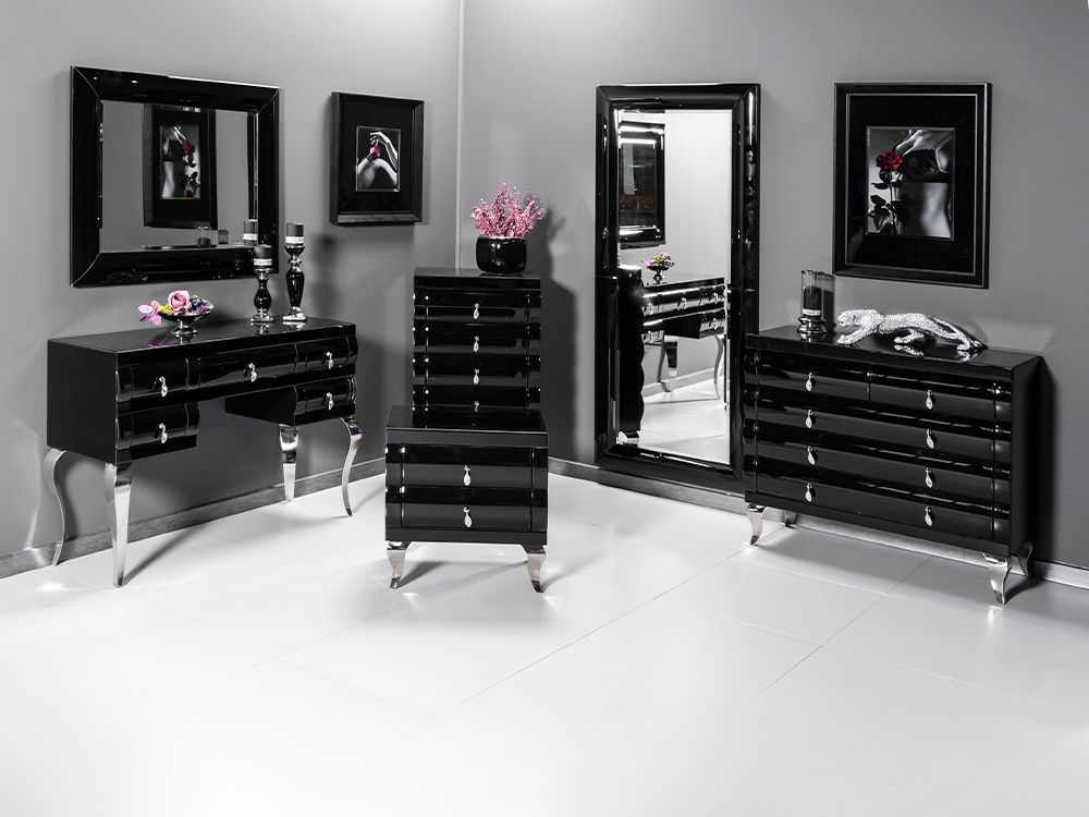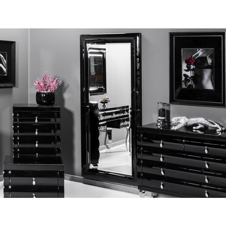 Elegáns, fekete színű 5 fiókos tükrös komód kristály fogantyúkkal, íves lábakkal.