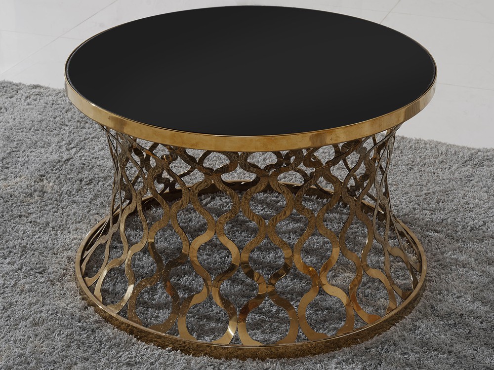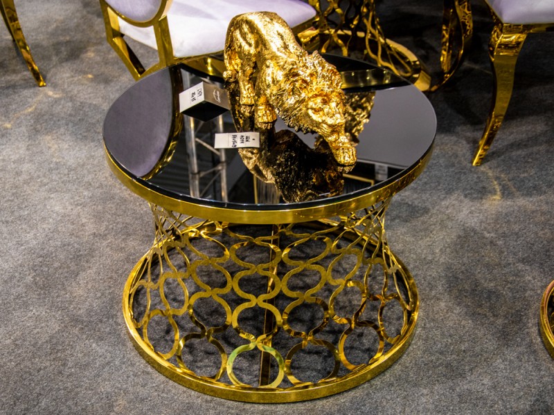 Modern dohányzóasztal arany színű vázzal, fekete üveglappal.