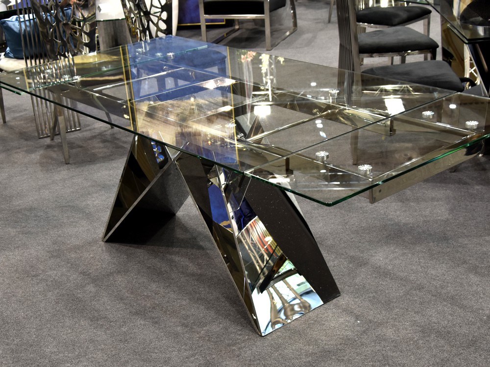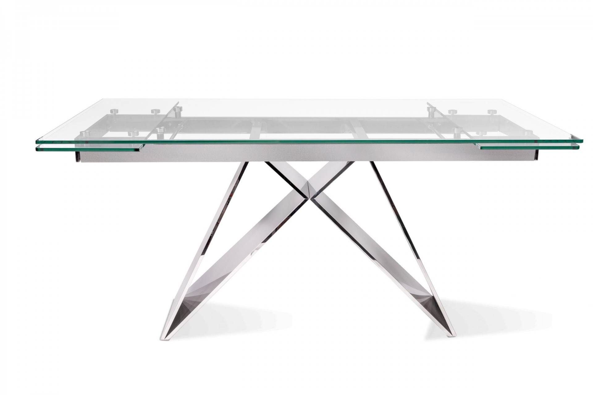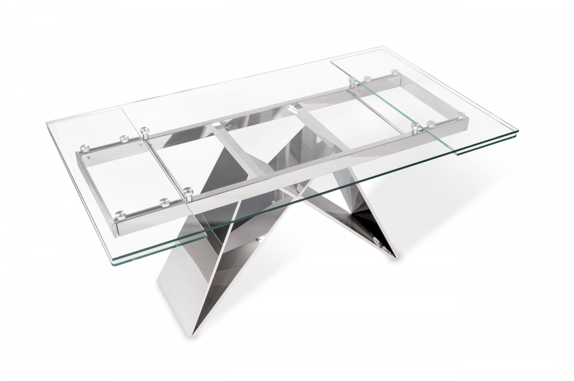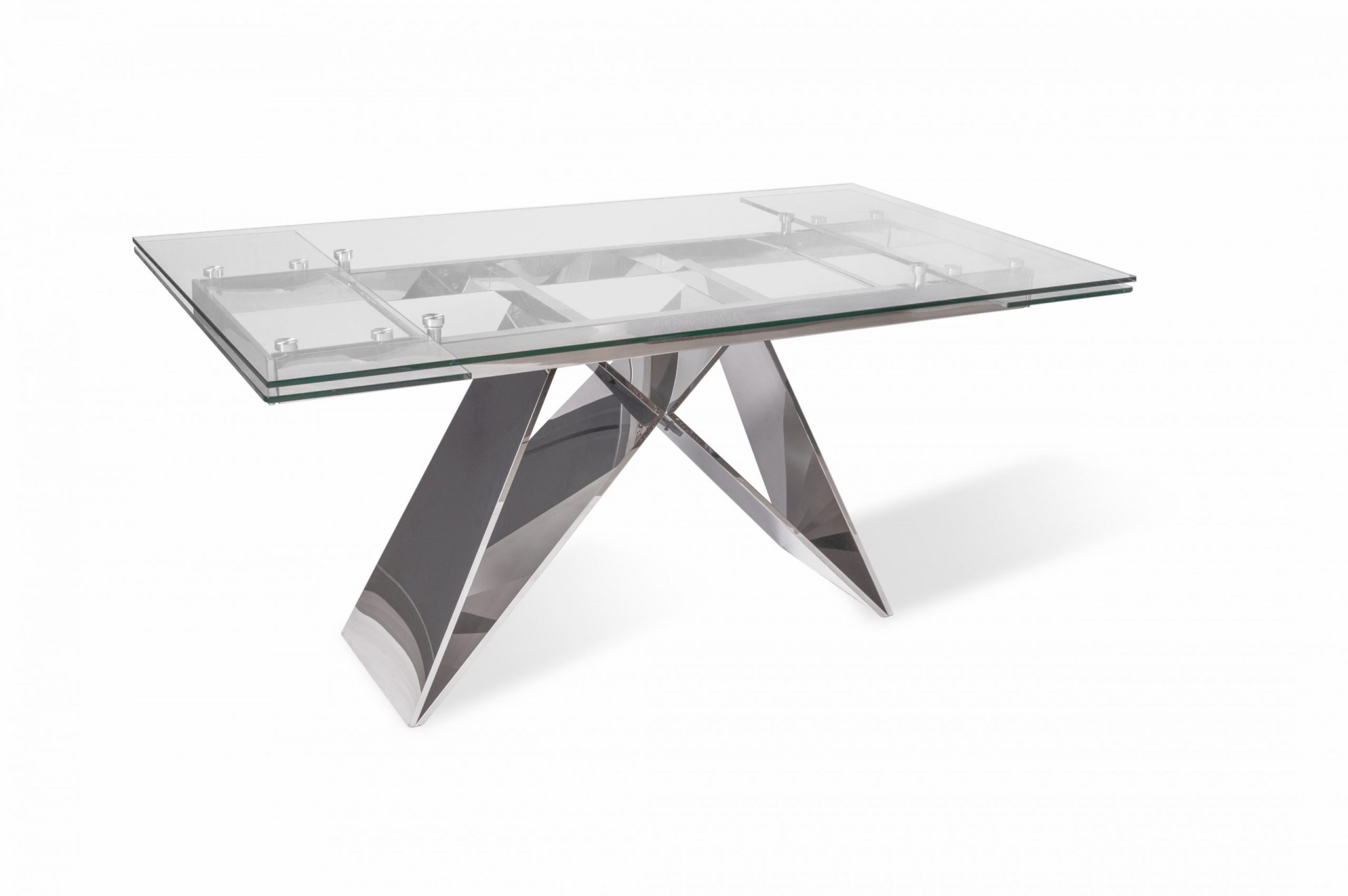 Modern, üveglapos bővíthető design étkezőasztal krómacél lábazattal.