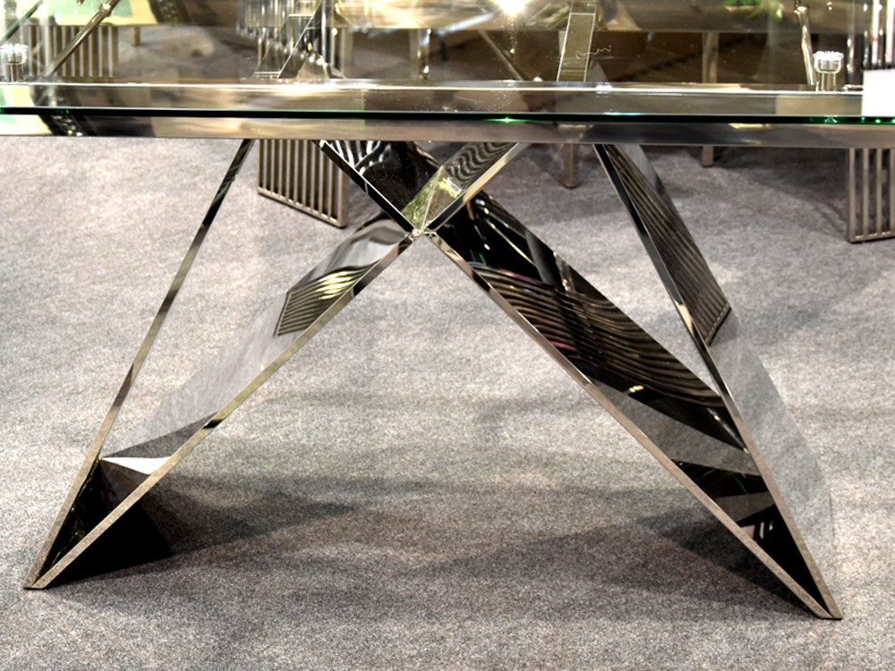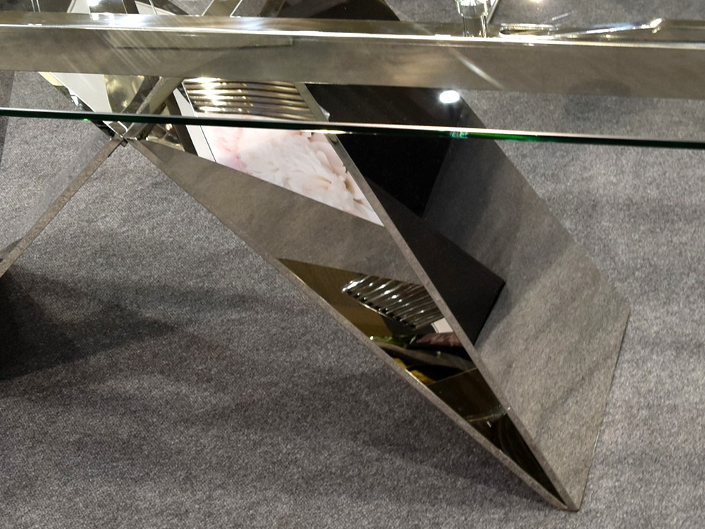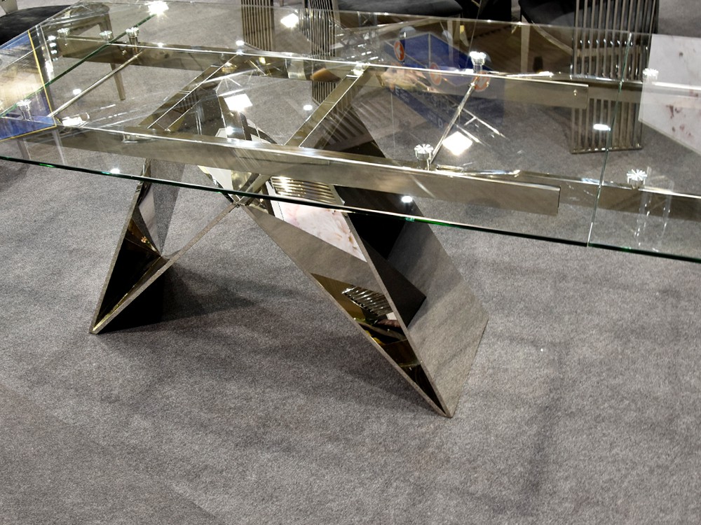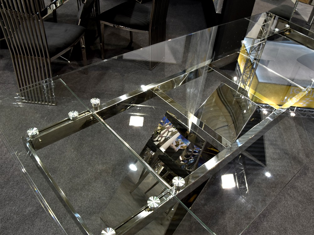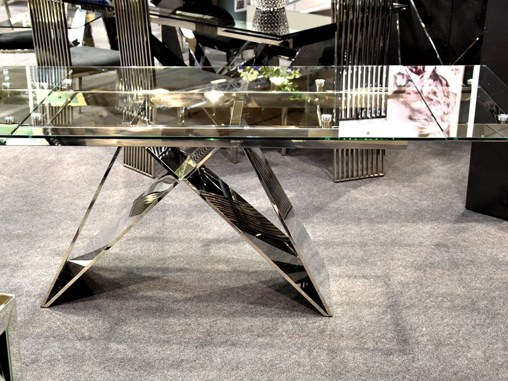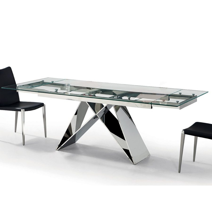 Modern, üveglapos bővíthető design étkezőasztal krómacél lábazattal.