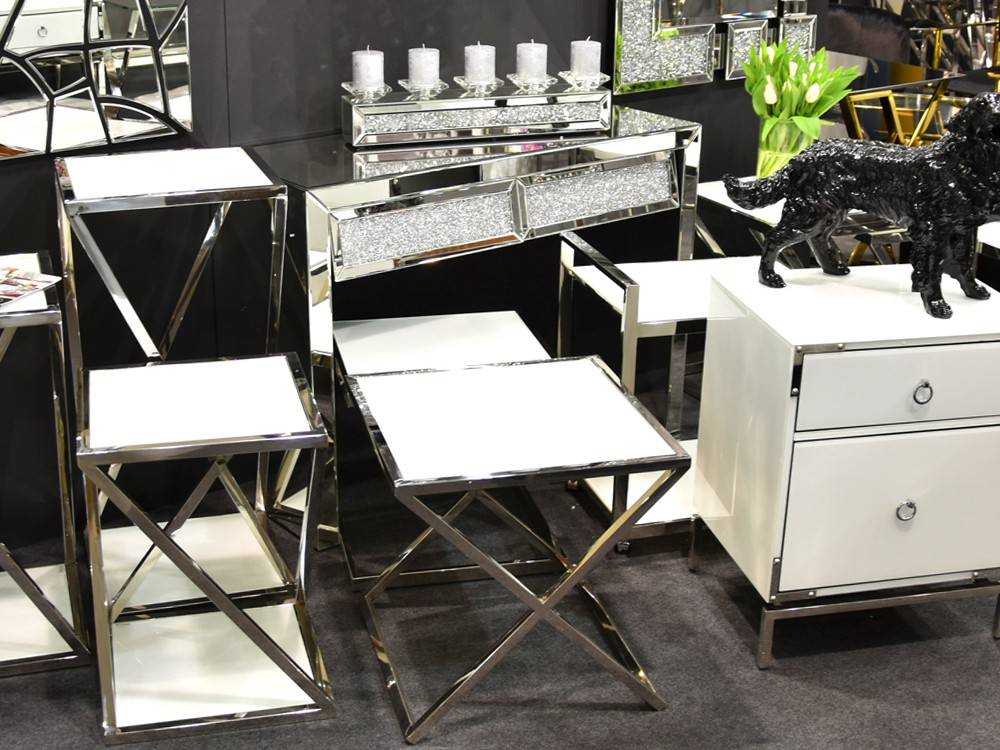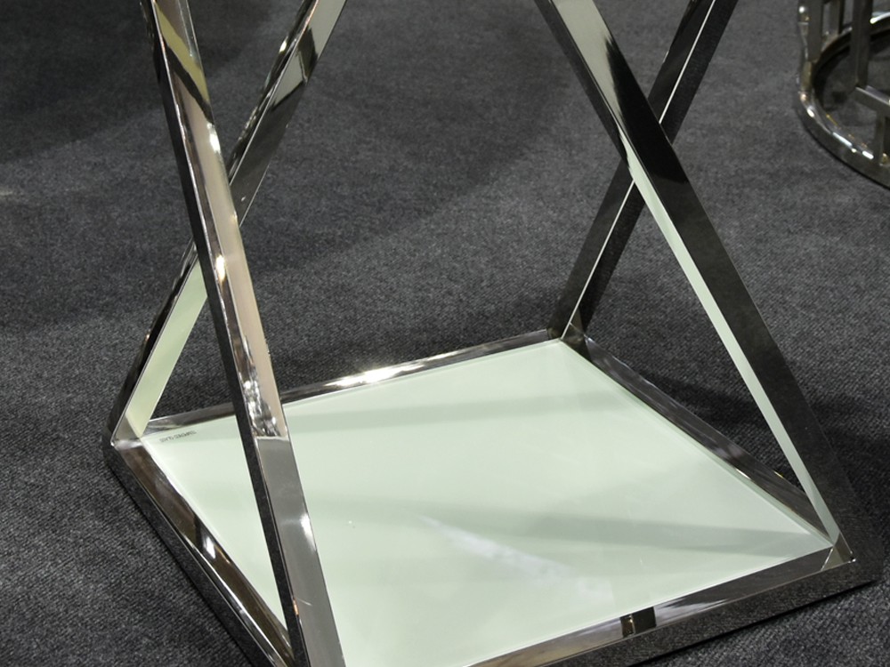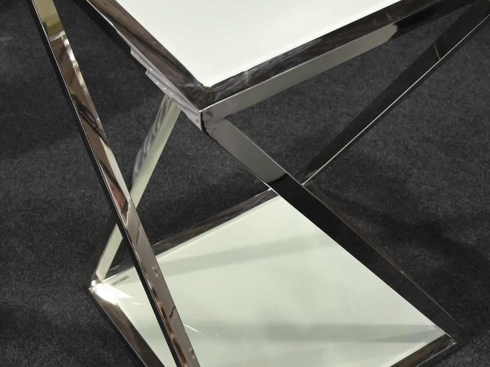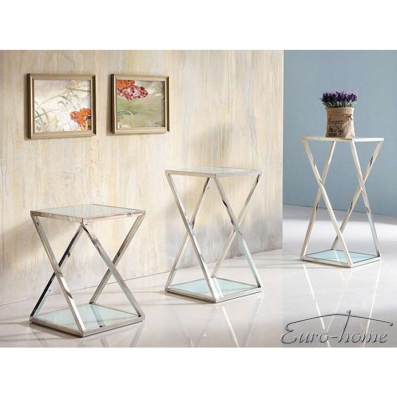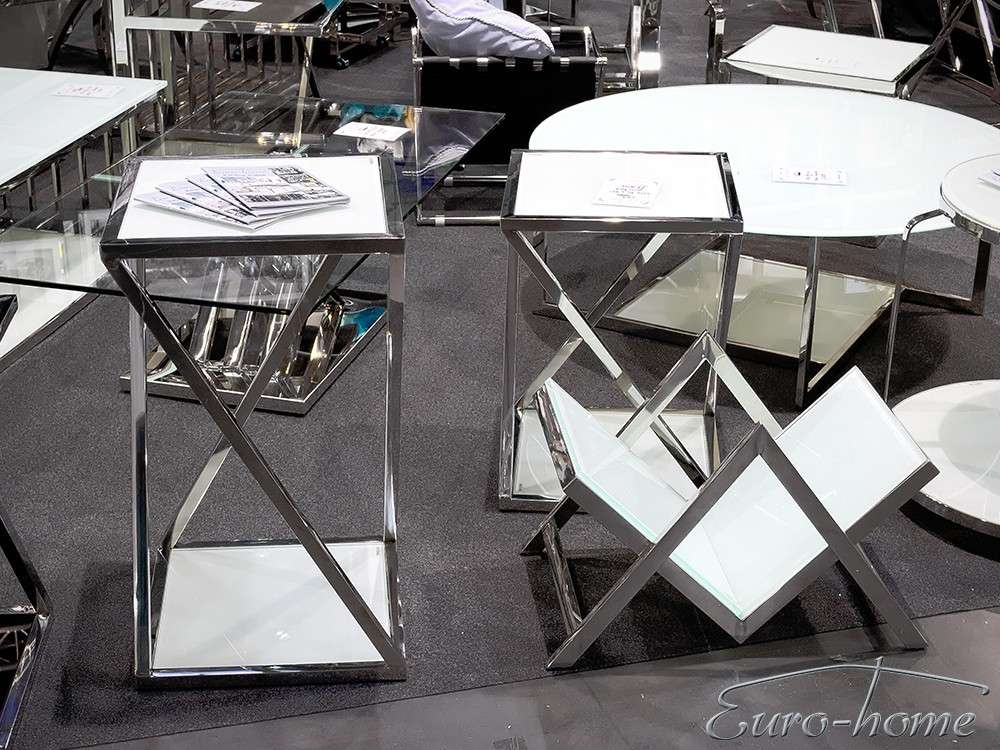 Modern virágtartó állvány fehér üveglappal, krómacél vázzal, háromféle méretben (külön-külön is rendelhető).