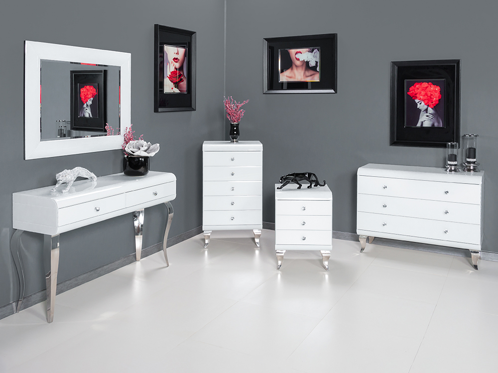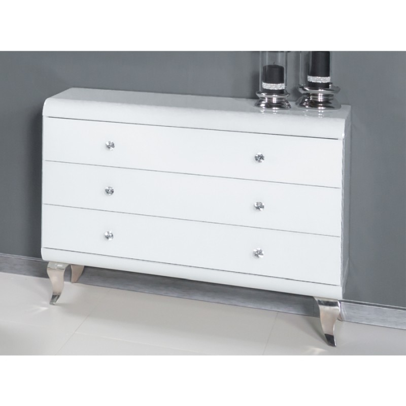 Elegáns fehér színű tükrös komód kristály fogantyúkkal, kecsesen ívelt lábakkal. A komód egy kollekció része, melynek többi eleme a termékfotón látható.
