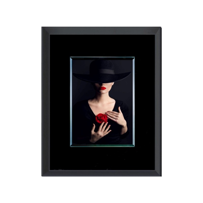 Elegáns, üveglapos fali kép fekete színű kerettel.