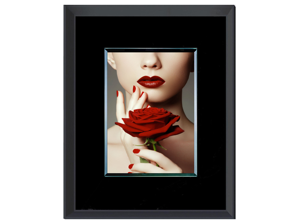 Elegáns, üveglapos fali kép fekete színű kerettel.