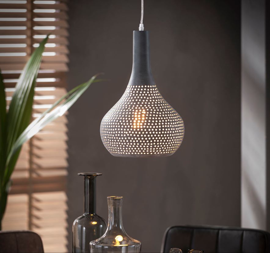 Design mennyezeti lámpa egyedi, kézzel készített, apró lyukakkal ellátott burával, izzó nélkül, kétféle színben. A lámpatest textillel borított kábellel csatlakozik a rögzítőpanelhez. A lámpához külön izzó is rendelhető.