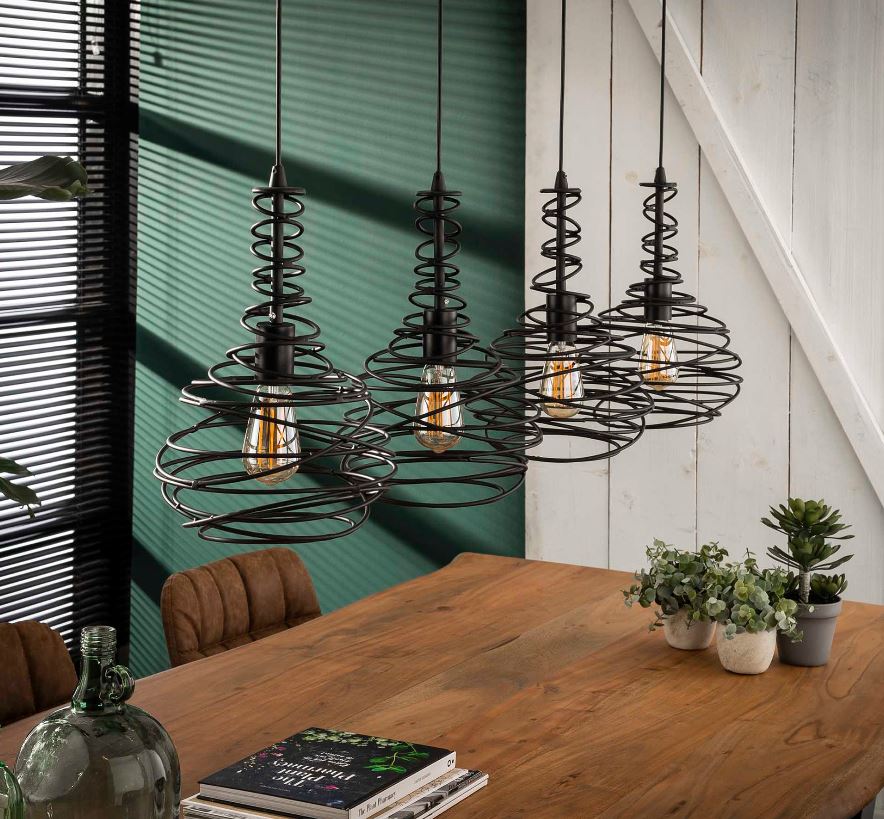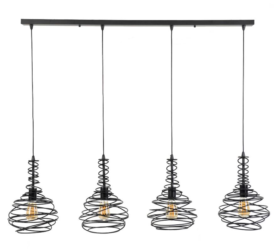 Indusztriális stílusú design mennyezeti lámpa négy darab, porszórt acélból készült burával, állítható magassággal, izzók nélkül. A lámpához külön izzók is rendelhetőek.