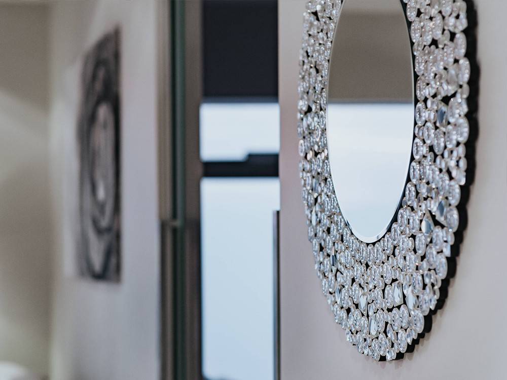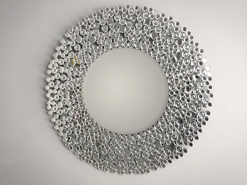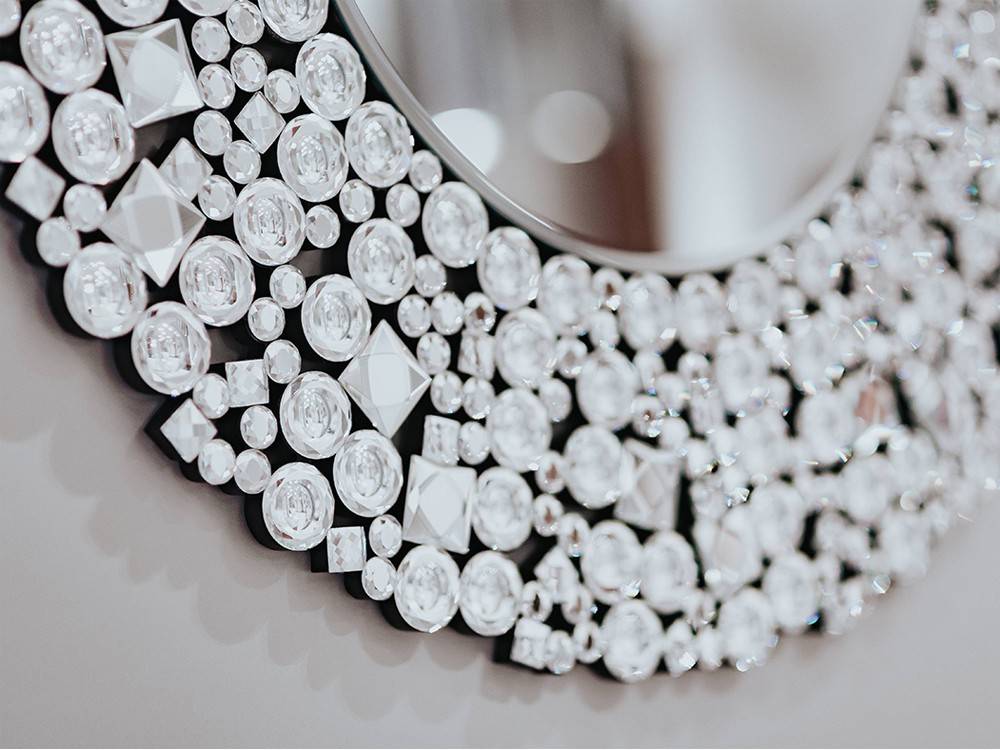Elegáns fali tükör apró kristályokkal díszített kerettel.