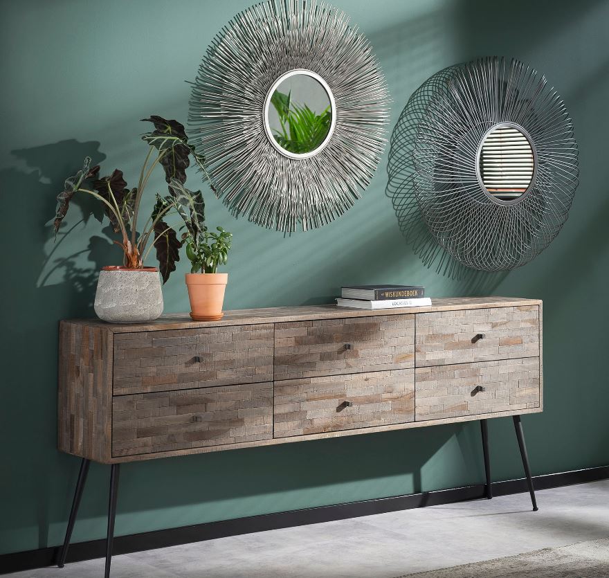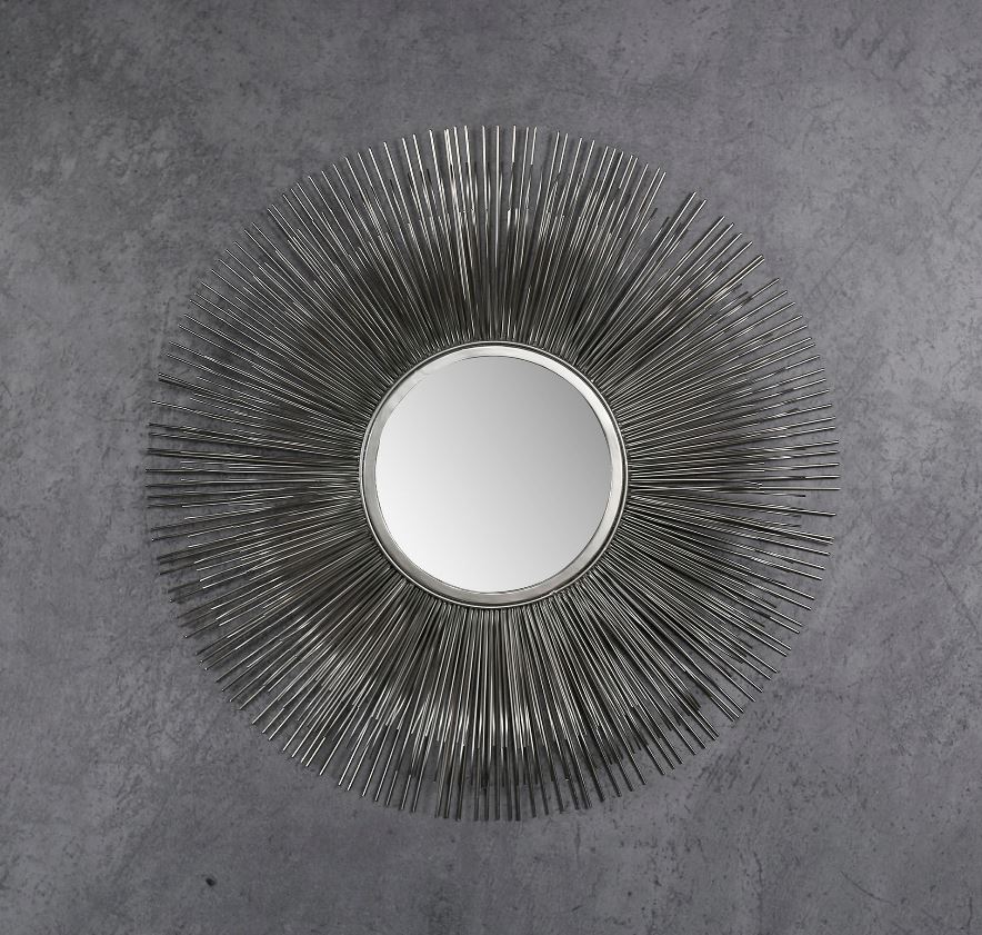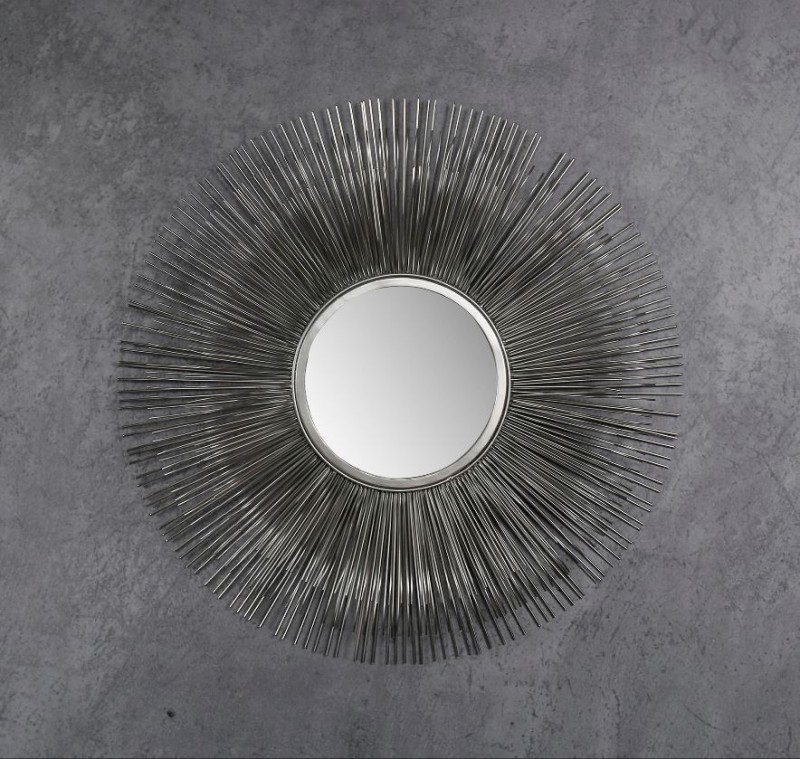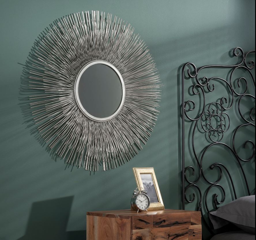 Elegáns design tükör a Napra emlékeztető formával, fém kerettel. A tükör keret nélküli átmérője 30 cm.
