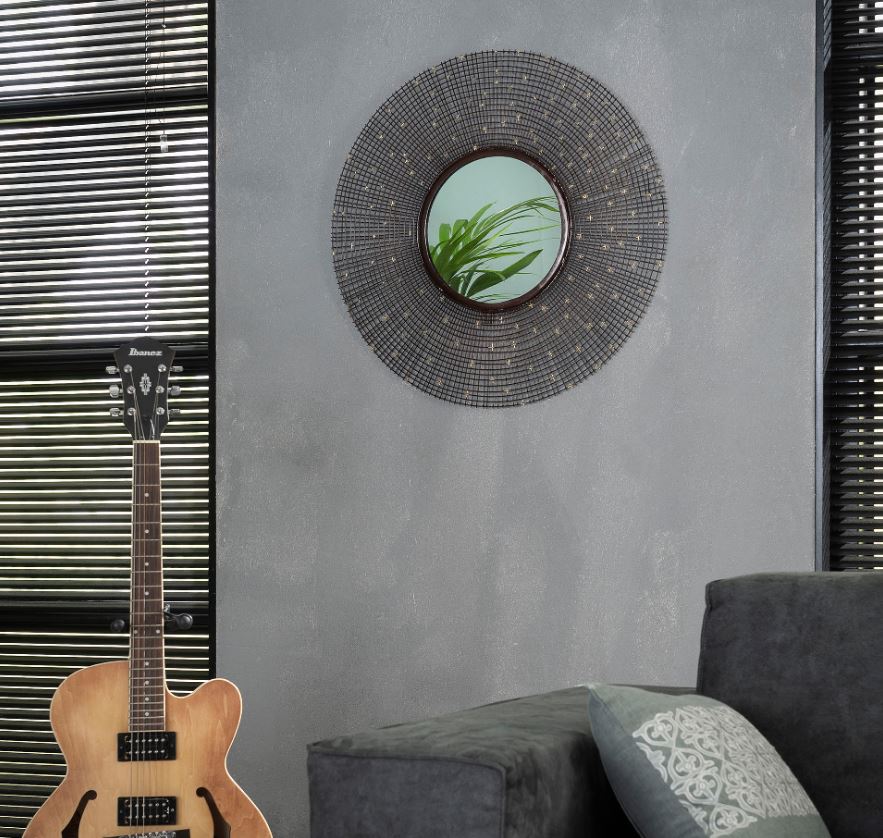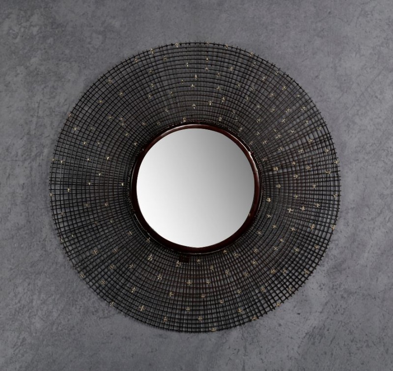 Elegáns design tükör a Napra emlékeztető formával, fém kerettel. A tükör keret nélküli átmérője 30 cm.