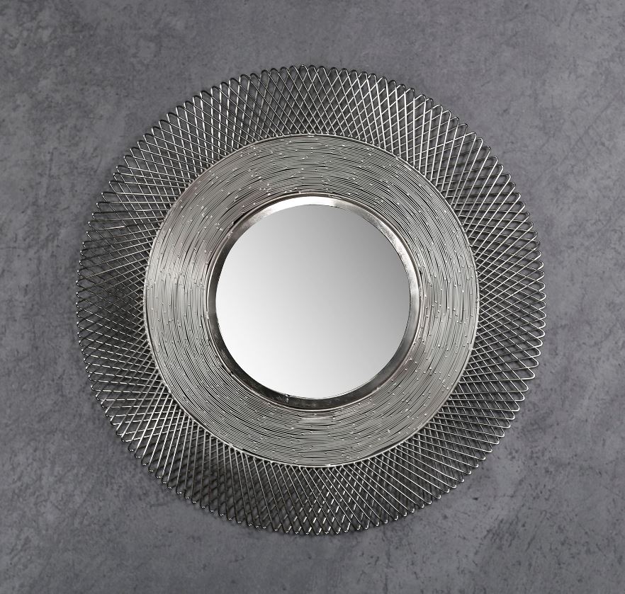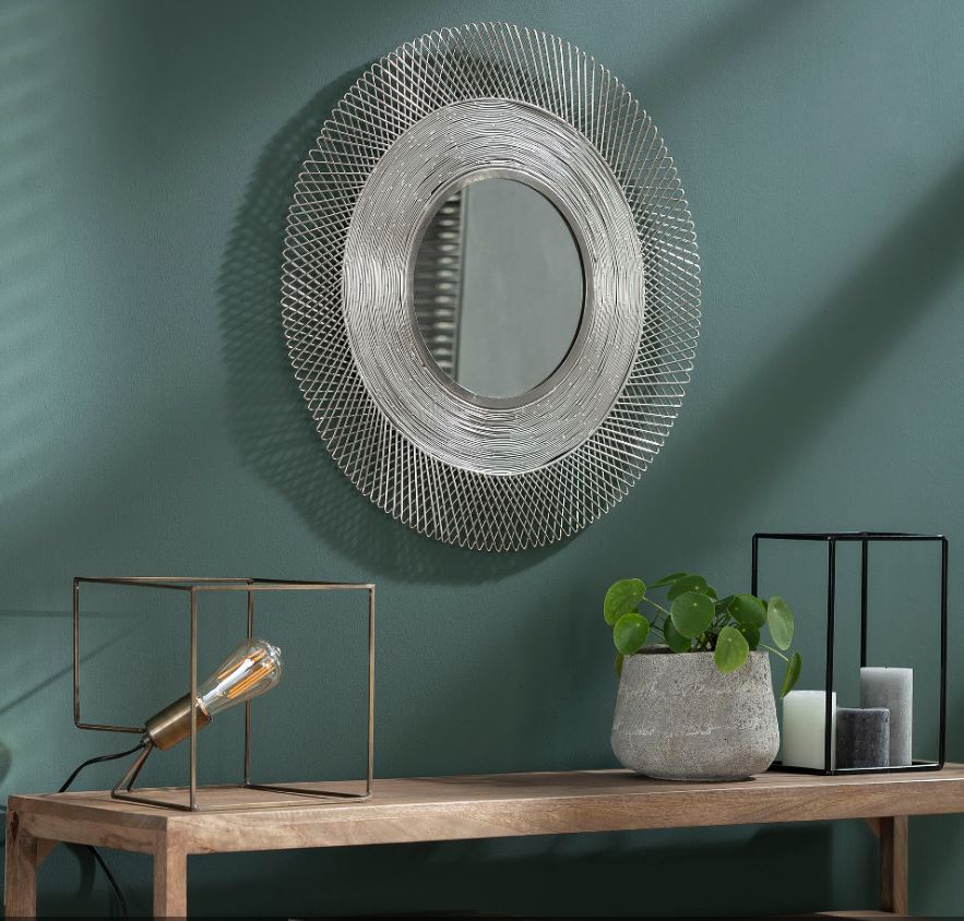 Elegáns design tükör a Napra emlékeztető formával, fém kerettel. A tükör keret nélküli átmérője 30 cm.