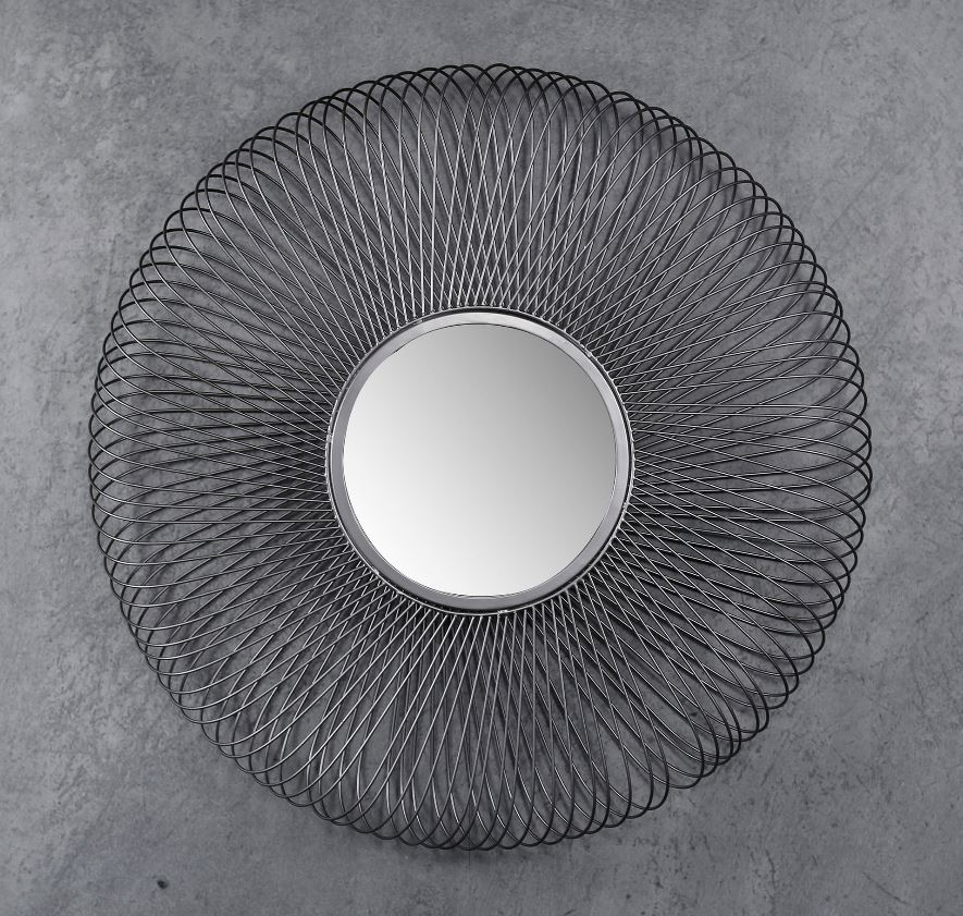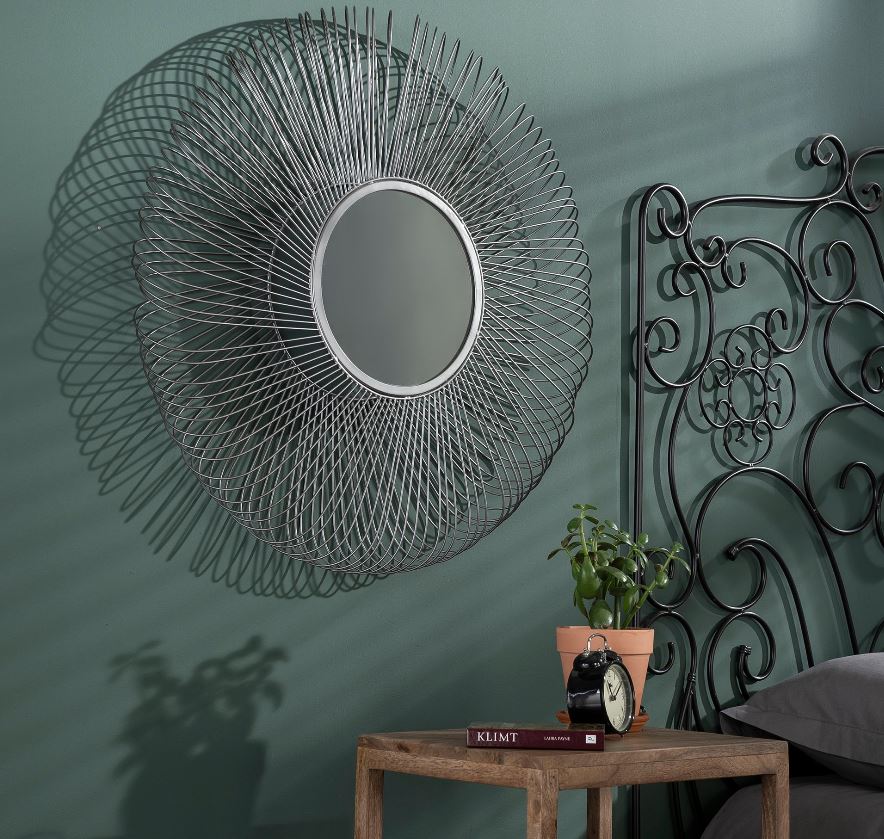 Elegáns design tükör a Napra emlékeztető formával, fém kerettel. A tükör keret nélküli átmérője 35 cm.