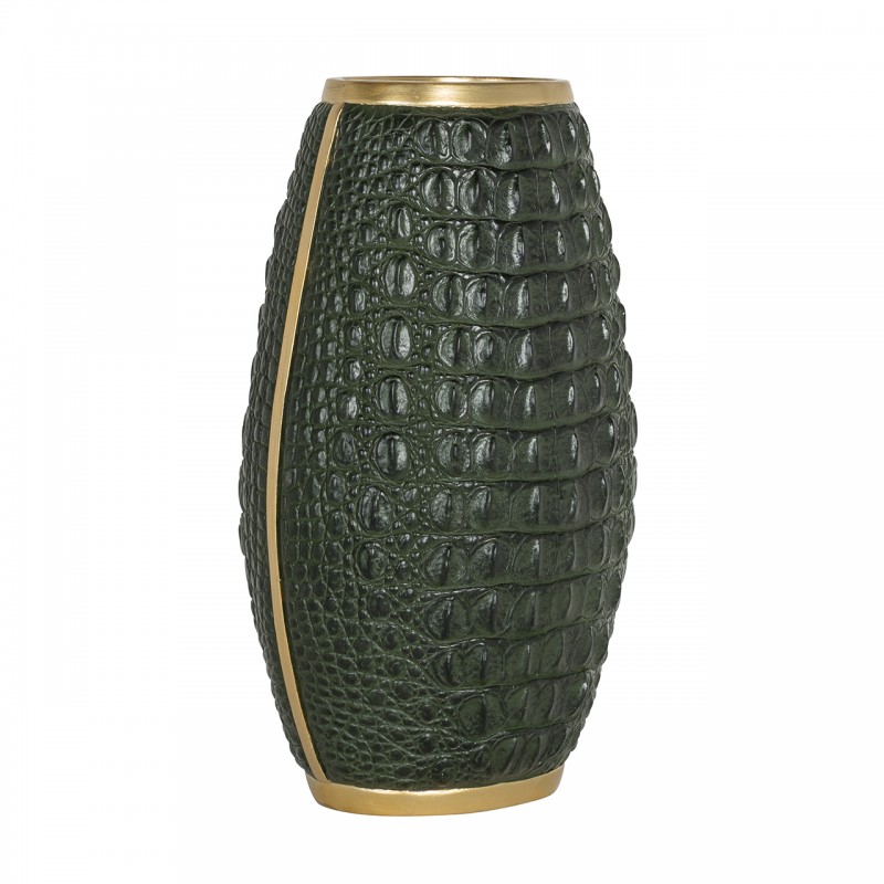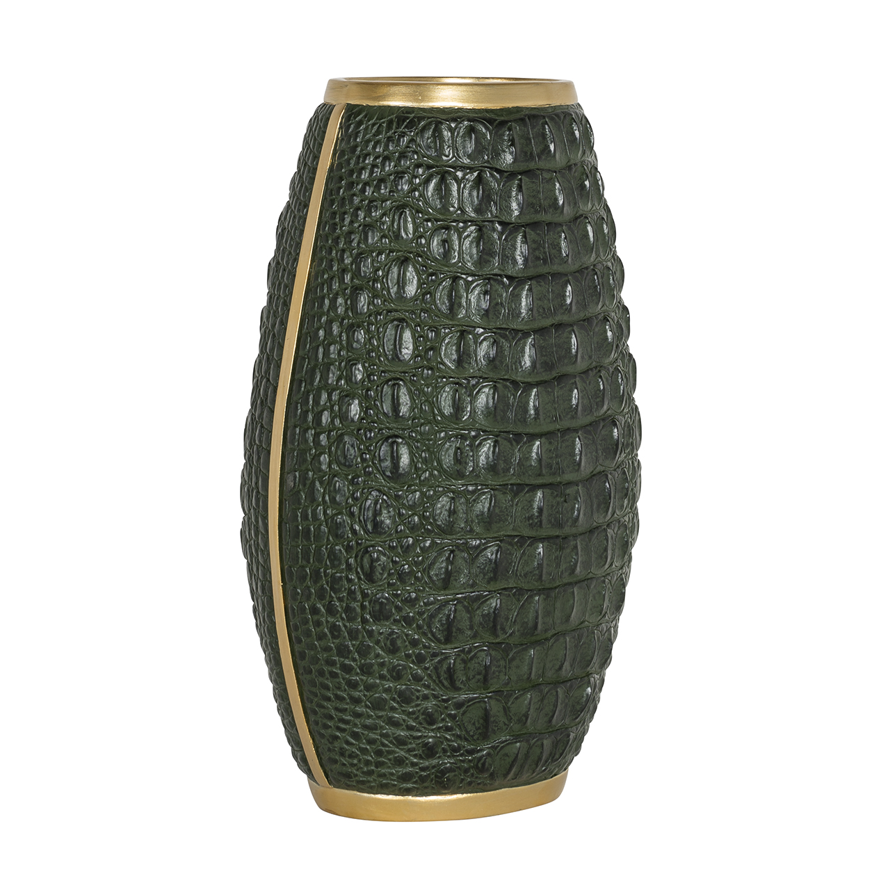 Méregzöld-arany színű váza. A krokodilbőr-hatású felület és a krómacél kombinációja rendkívül elegánssá teszi a terméket, mely mind modern, mind klasszikus enteriőrökbe kiválóan illeszkedik.