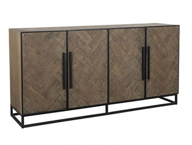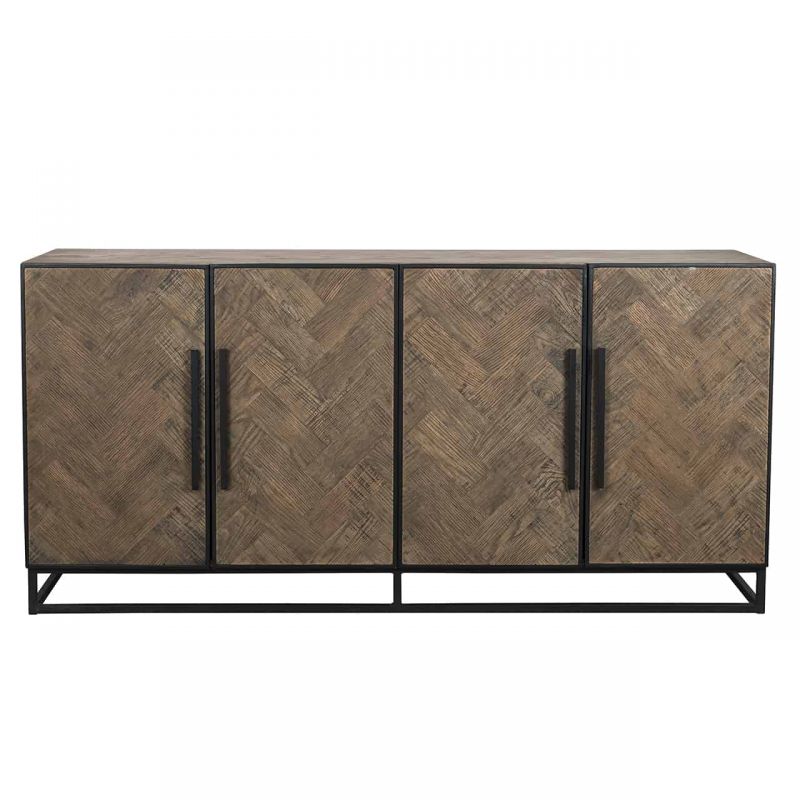 Indusztriális stílusú komód halszálka mintázatú fa lappal, elegáns, feketére festett lábakkal.
