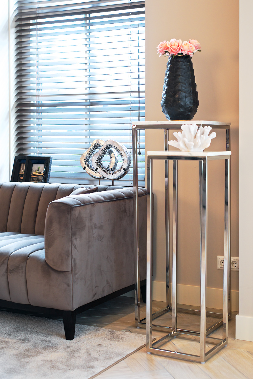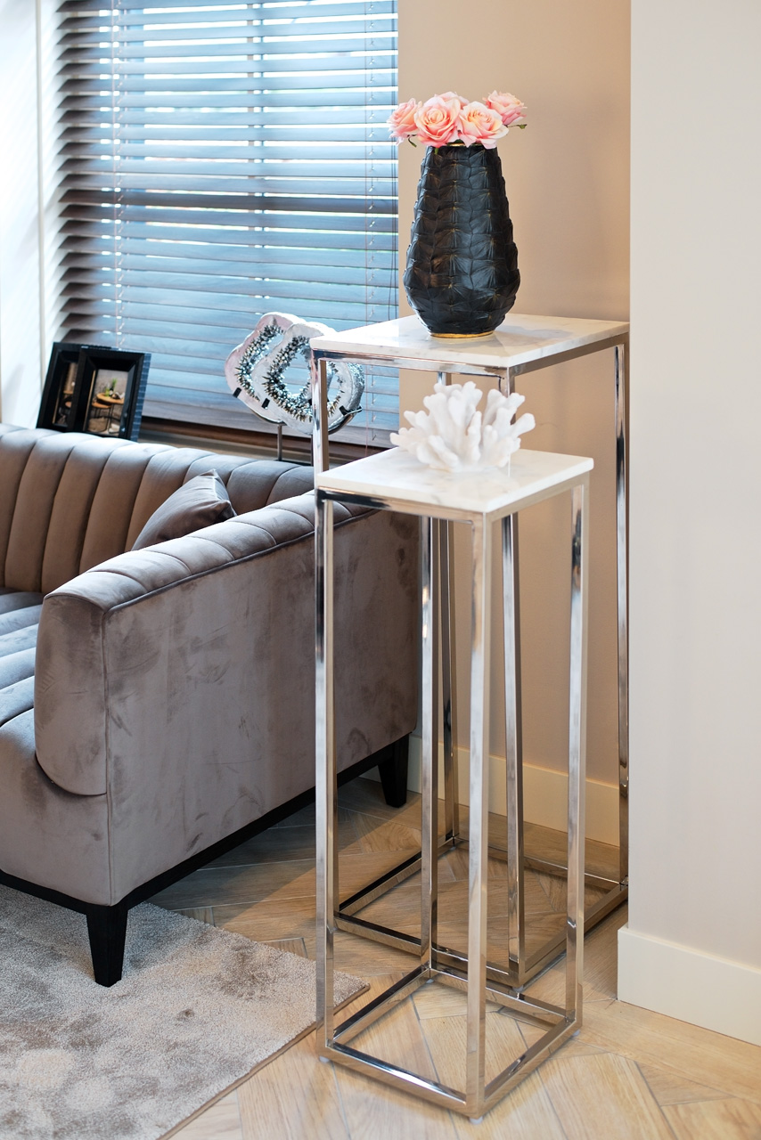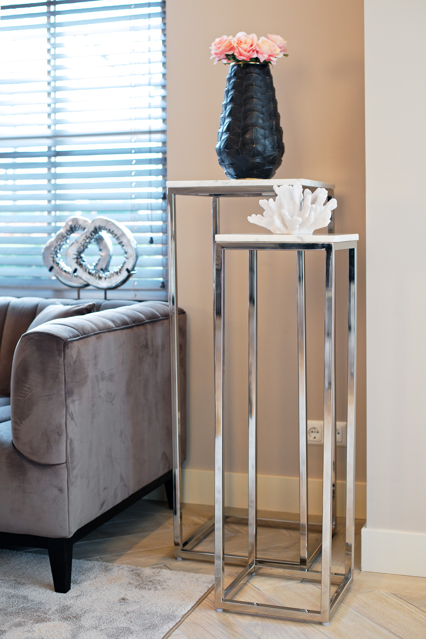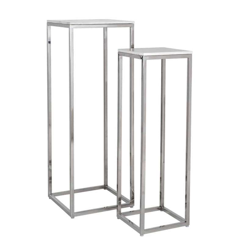 Modern, elegáns, márványlapos virágtartó-állvány szett, krómacél lábakkal.