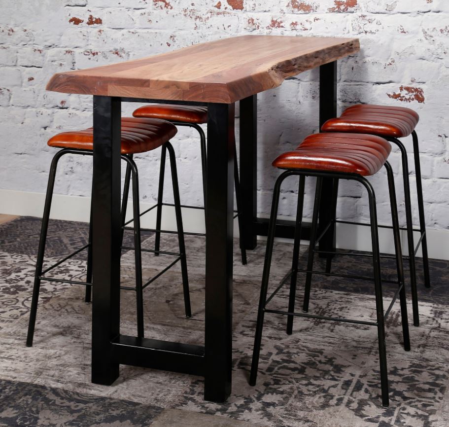 Indusztriális stílusú bárasztal lakkozott, ellenőrzött forrásból származó 8 cm vastagságú akácia lappal, masszív rozsdamentes acél lábakkal.