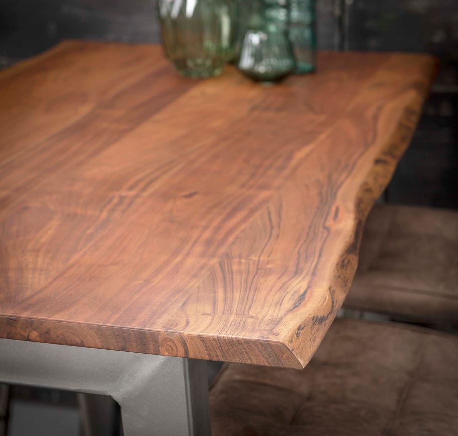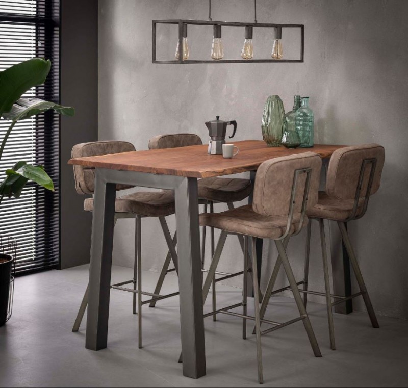 Indusztriális stílusú bárasztal lakkozott 2,5 cm vastagságú akácia lappal, masszív rozsdamentes acél lábakkal.