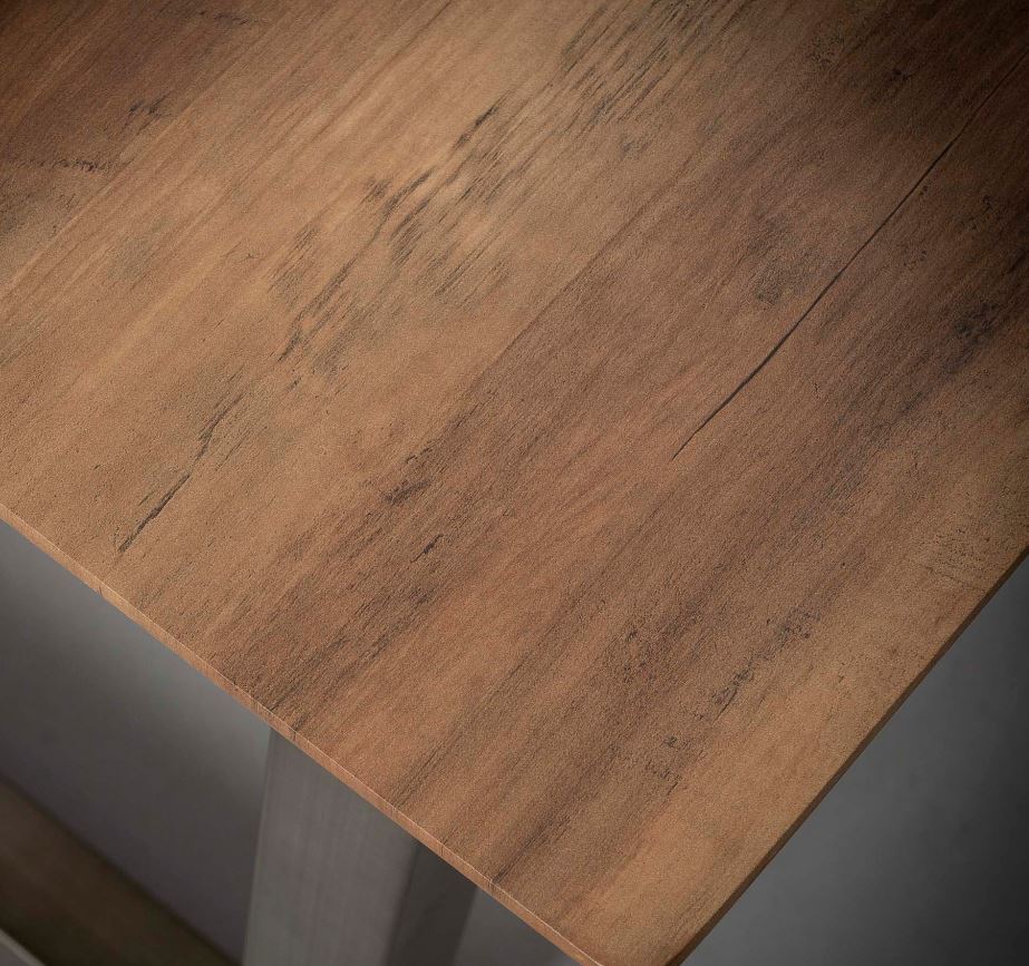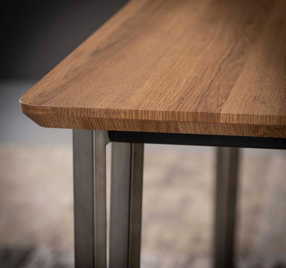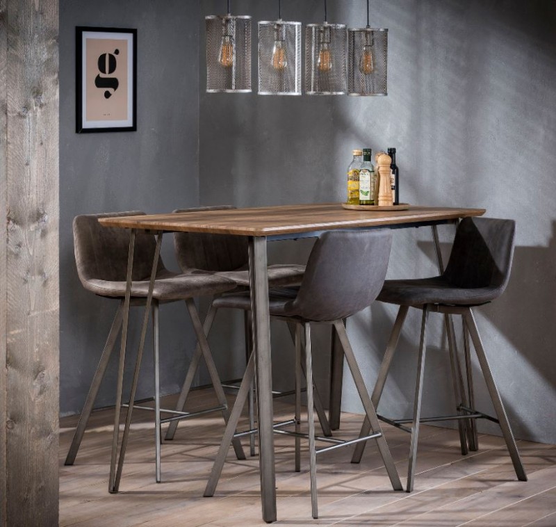 Indusztriális stílusú bárasztal, fa hatású MDF lappal, masszív rozsdamentes acél lábakkal.