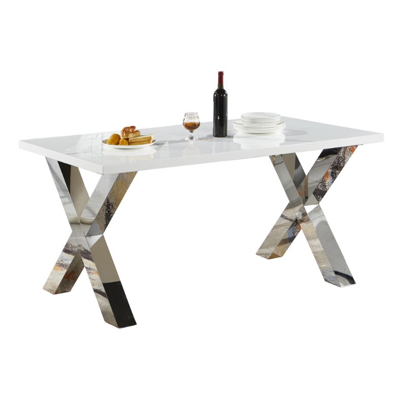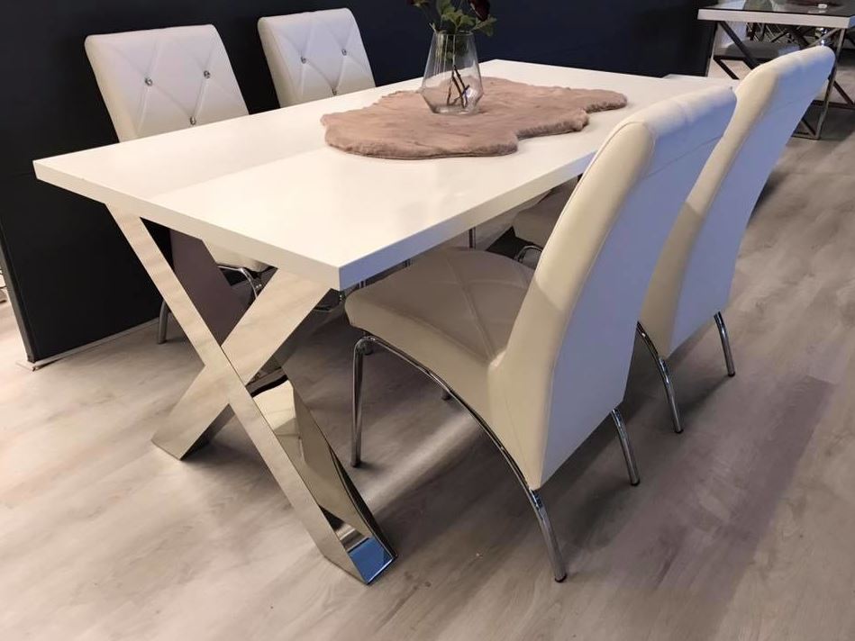 Stílusos étkezőasztal magasfényű fehlér lappal, krómacél vázzal, többféle méretben.