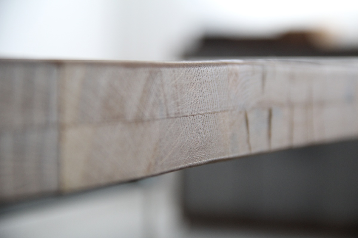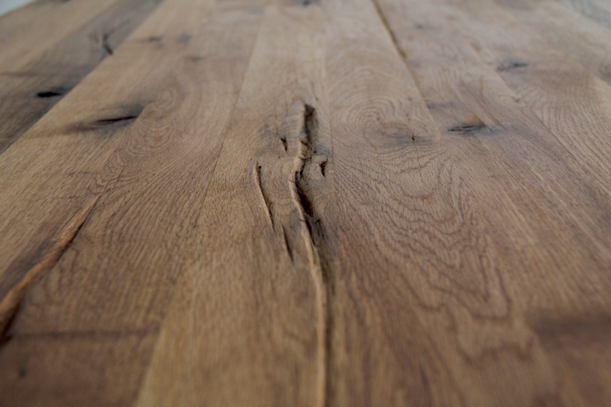 Asztallap anyaga: rusztikus jellegű tömör tölgyfa (természetes repedésekkel, görcsökkel)