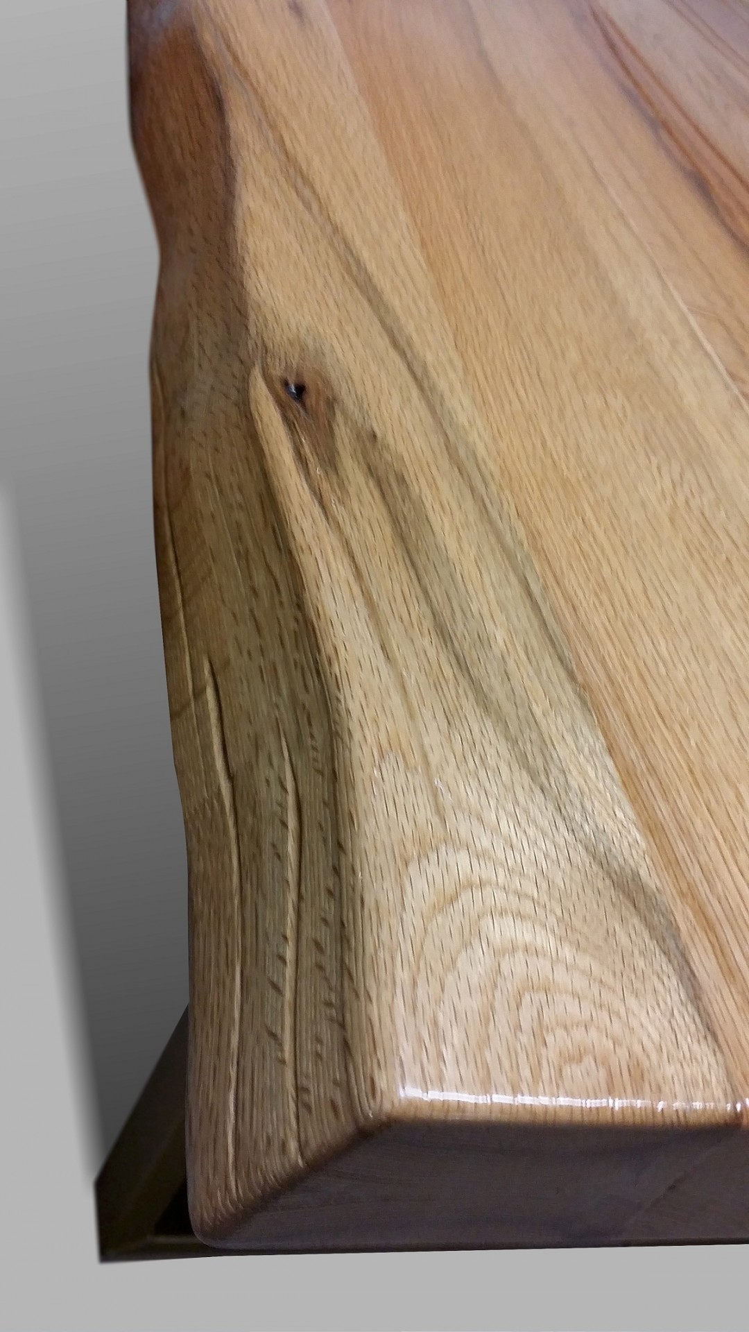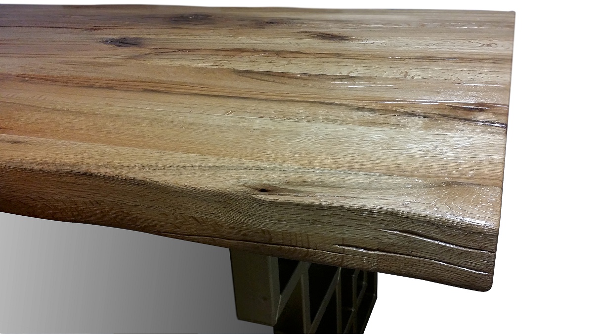 Asztallap anyaga: rusztikus jellegű tömör tölgyfa (természetes repedésekkel, görcsökkel)
