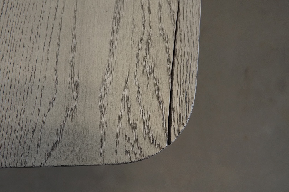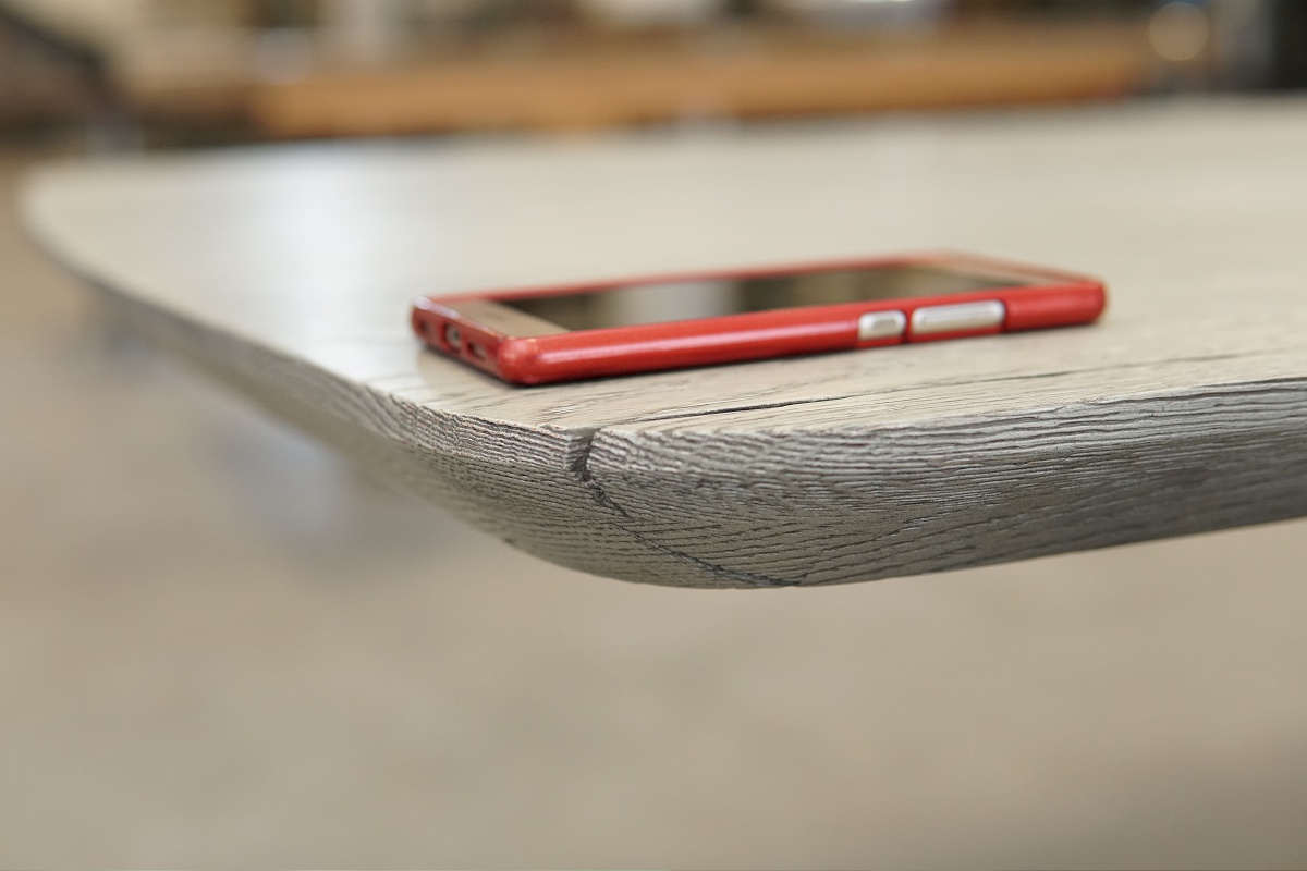 Asztallap anyaga: rusztikus jellegű tömör tölgyfa (természetes repedésekkel, görcsökkel)