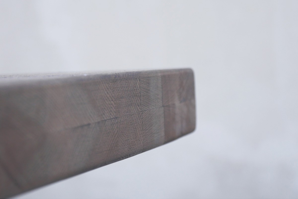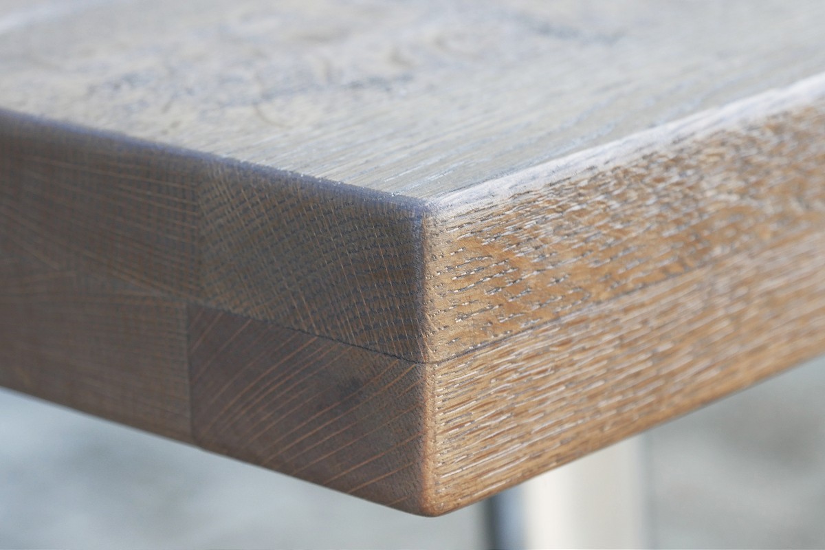 Asztallap anyaga: rusztikus jellegű tömör tölgyfa (természetes repedésekkel, görcsökkel)