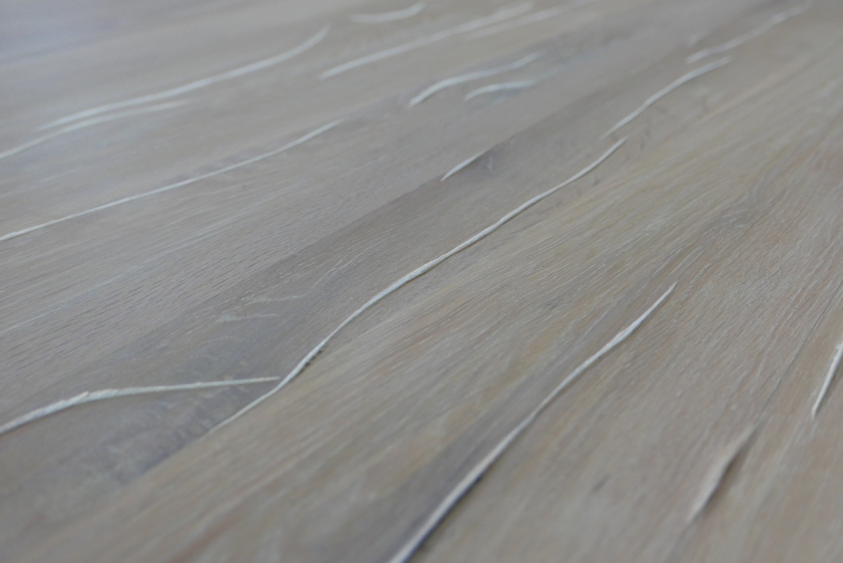 Asztallap anyaga: rusztikus jellegű tömör tölgyfa (természetes repedésekkel, görcsökkel)