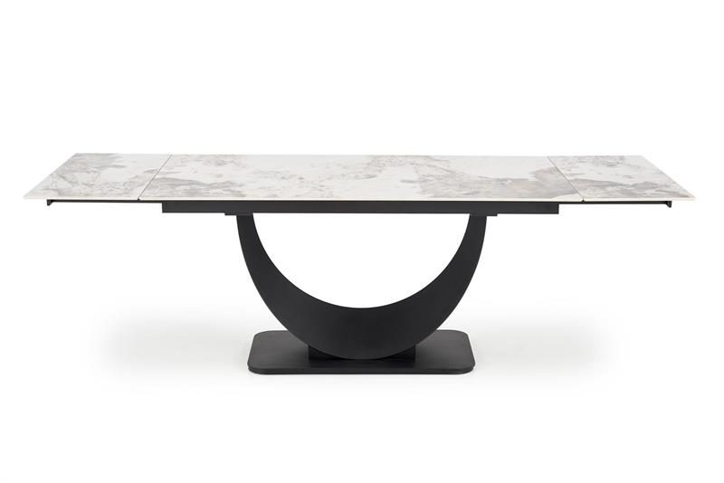 méretek: 160-240/92/75 cm; kihúzható asztal, anyag: szinterezett / porszórt acél, szín: asztallap – fehér márvány, lábak – fekete