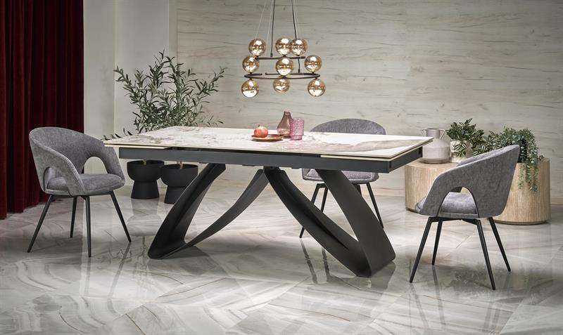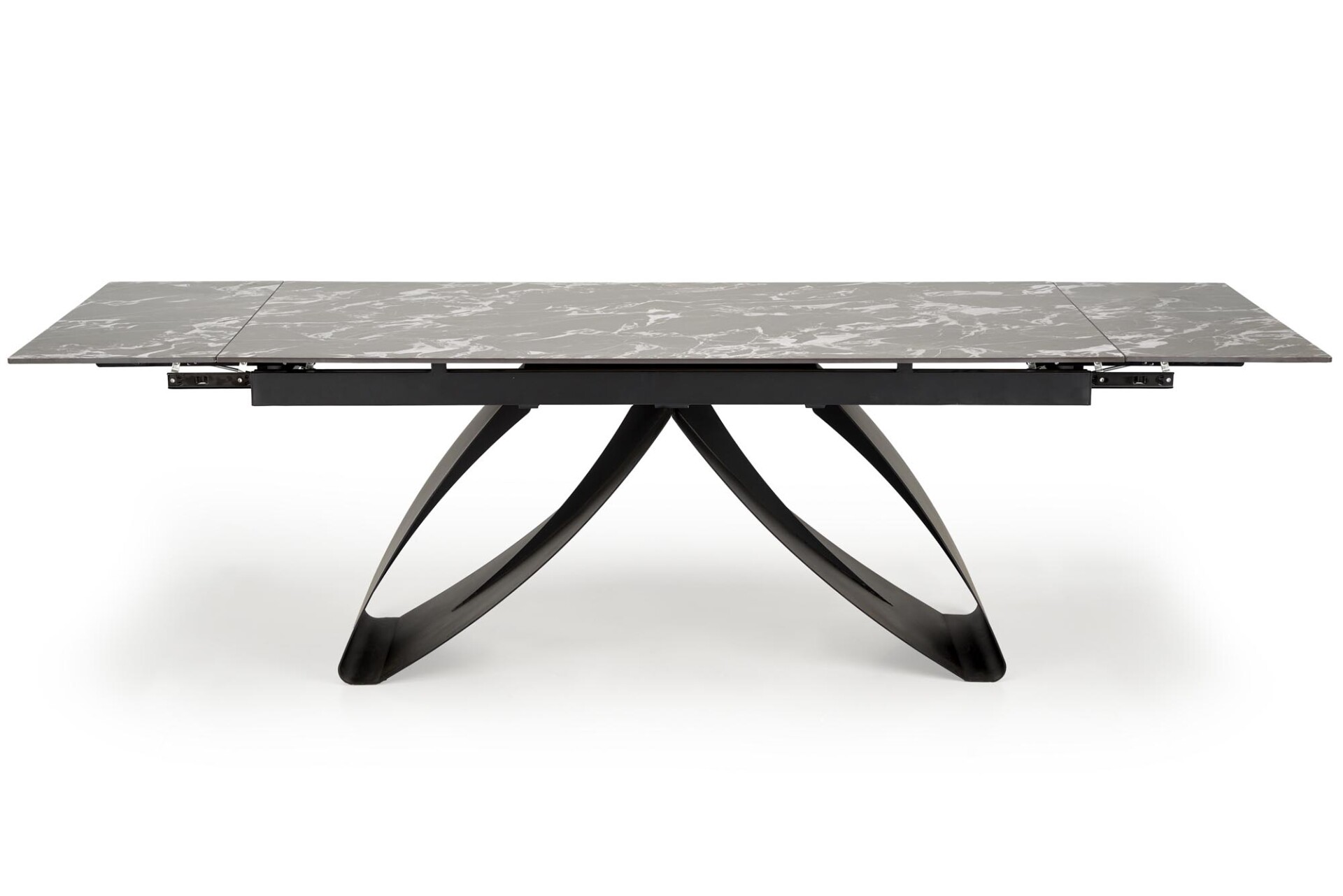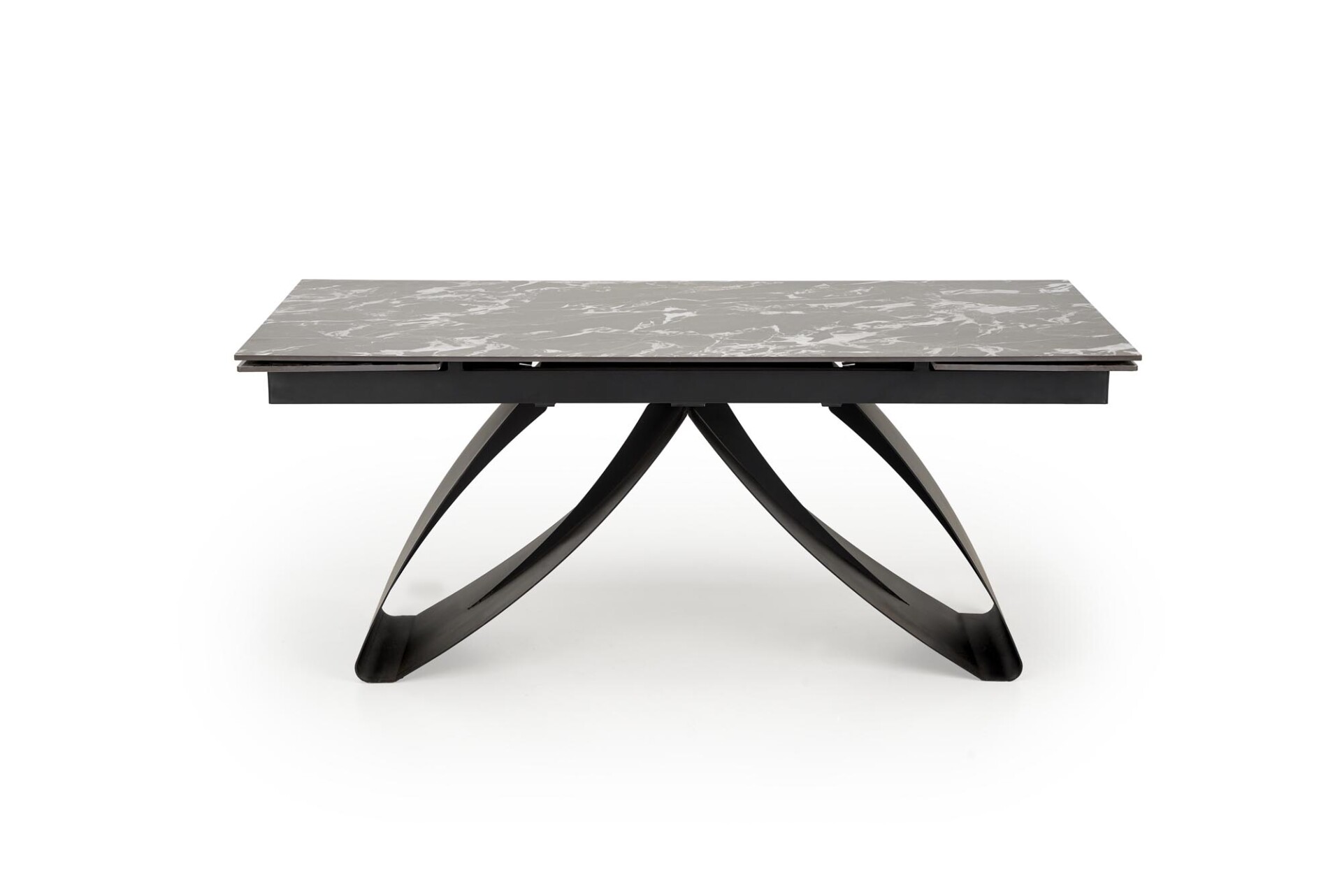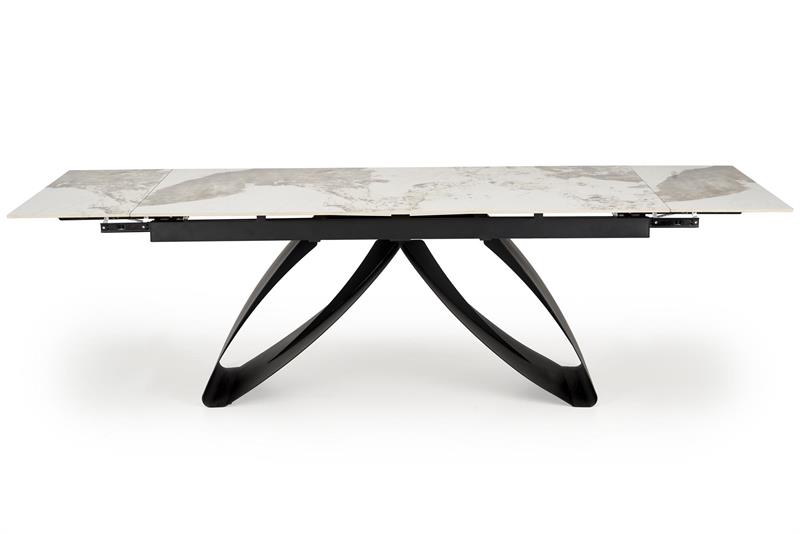 méretek: 180-260/90/75/125 cm; kihúzható asztal, anyag: szinterezett / porszórt acél, szín: asztallap – fehér vagy fekete márvány, lábak – fekete