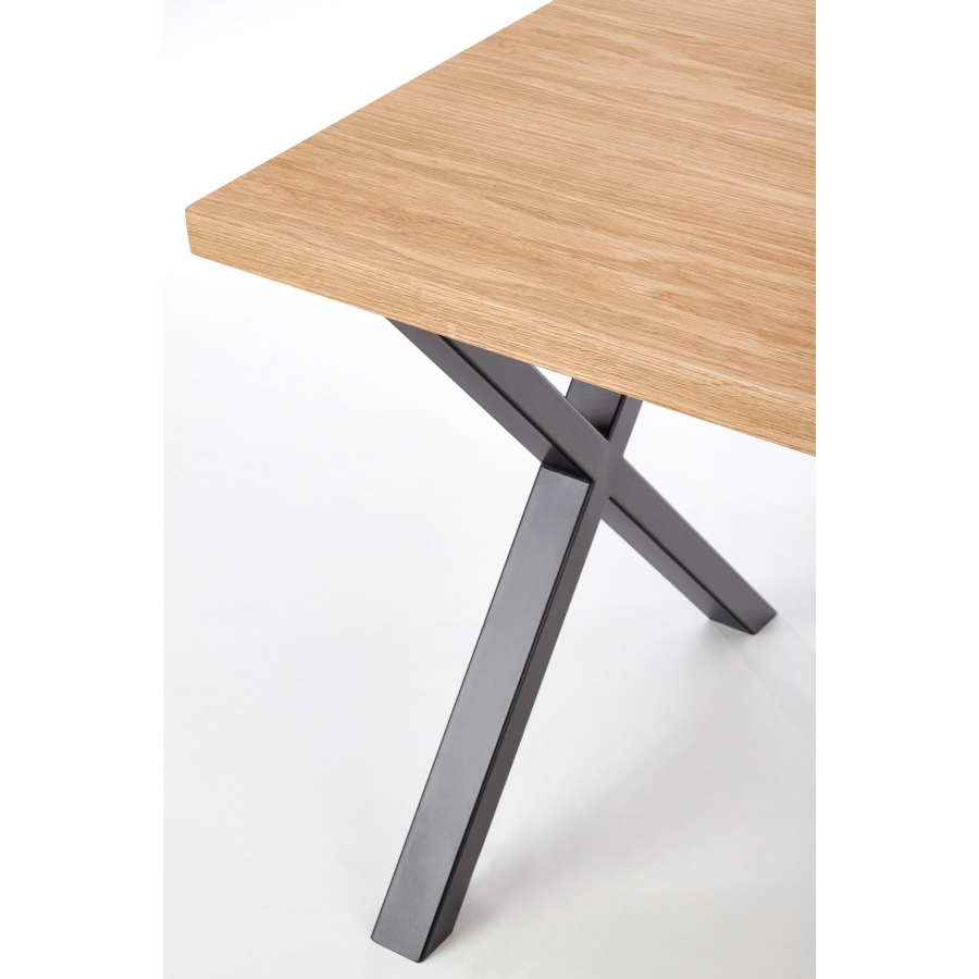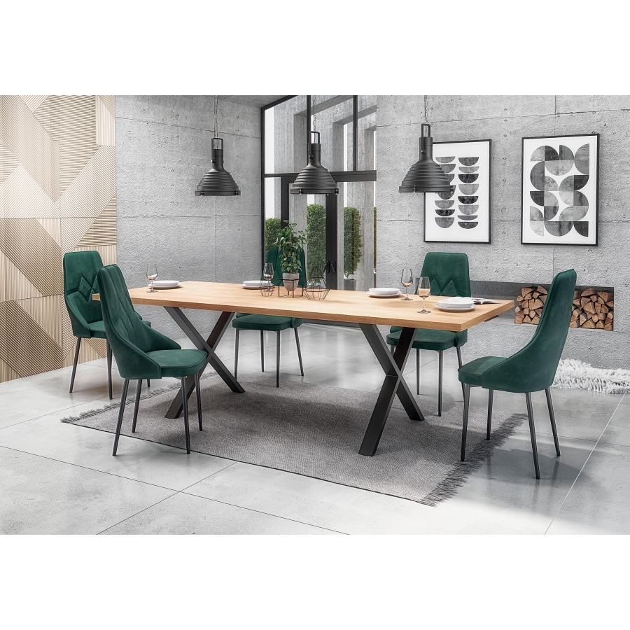 Modern, bővíthető étkezőasztal tömör tölgyfa lappal, porszórt acél ‘X’ lábakkal.