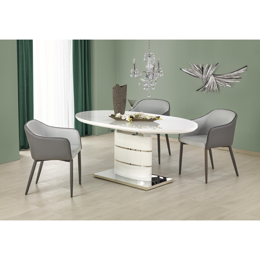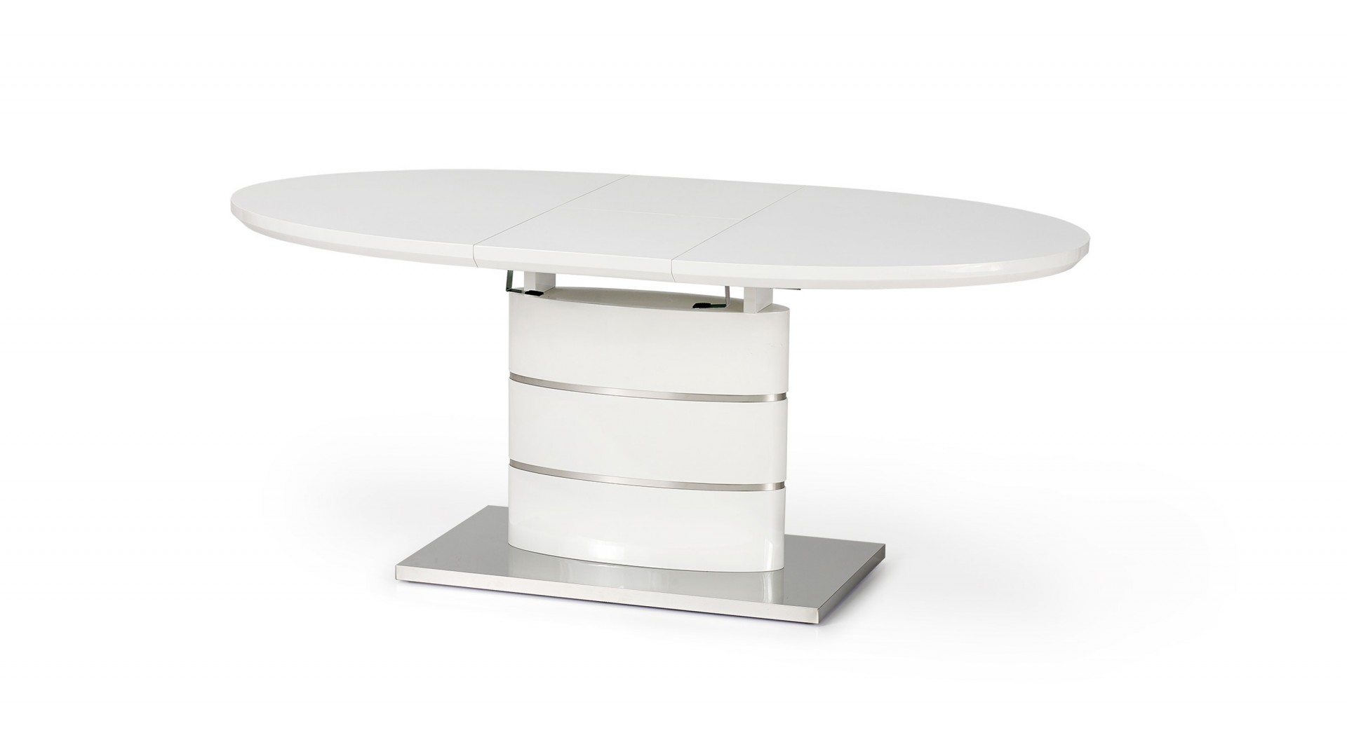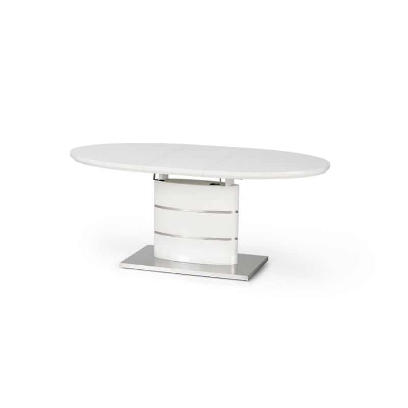 Modern, magasfényű fehér, bővíthető étkezőasztal, rozsdamentes acél vázzal.